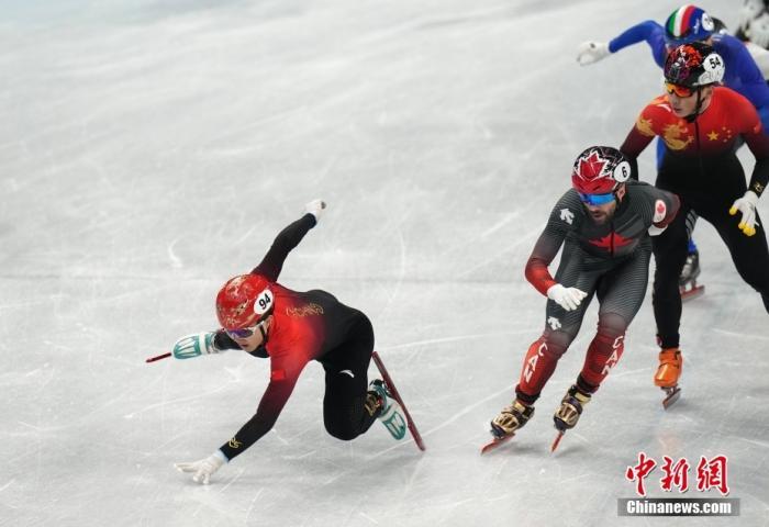 北京冬奥会短道速滑项目男子5000米接力半决赛,李文龙不慎摔倒。 中新社记者 崔楠 摄