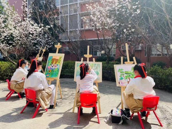 “碧玉妆成一树高,万条垂下绿丝绦。不知细叶谁裁出,二月春风似剪刀。”在明德苑中,经典诵读班的孩子们身着汉服,围坐在蒲团上,在刘莹老师指导下开展“咏”绿经典诵读活动。师生们在暖阳下舒展身姿,春风拂过,抖落一身旖旎。五年级古筝班的孩子用古筝为大家弹奏出动人的旋律《春去春又来》,小伙伴们被琴声吸引,有的不由自主地跳出流畅的舞步,有的摆起画架拿起画本……
