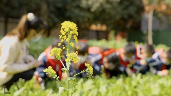 英语教师朱小霞带领学生“探”绿,用英语给学生们介绍校园绿植常识。通讯员何宗兴供图