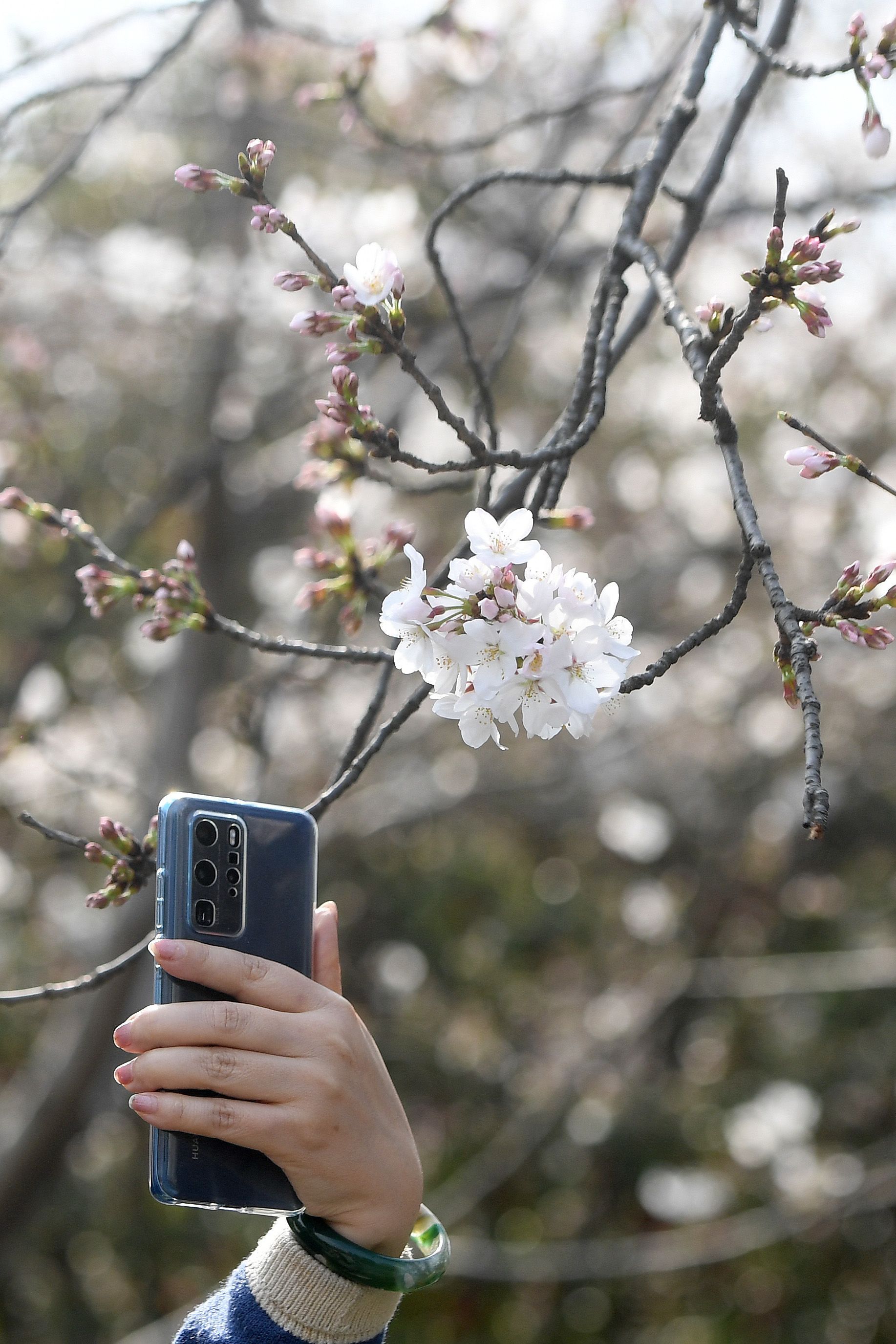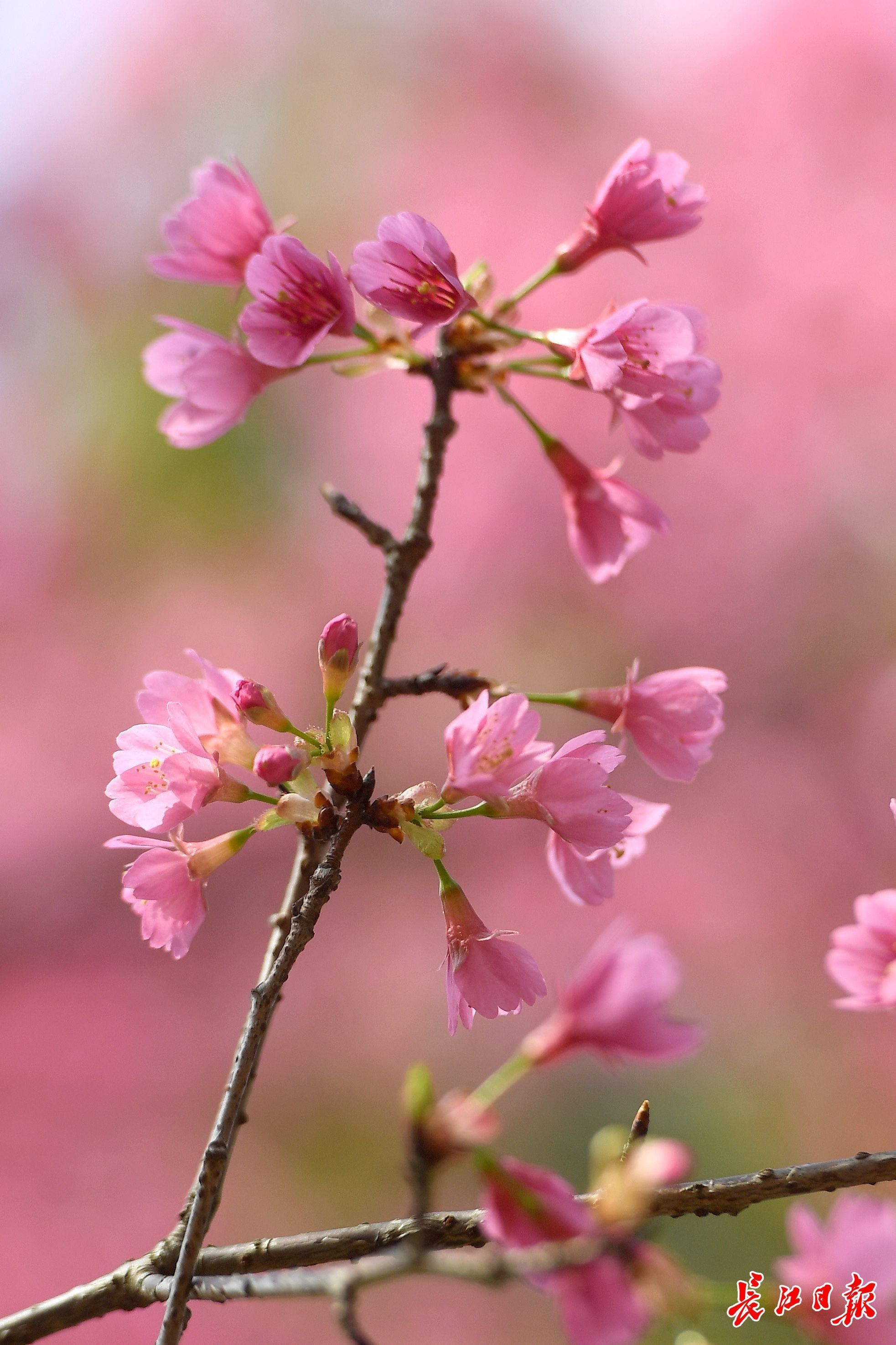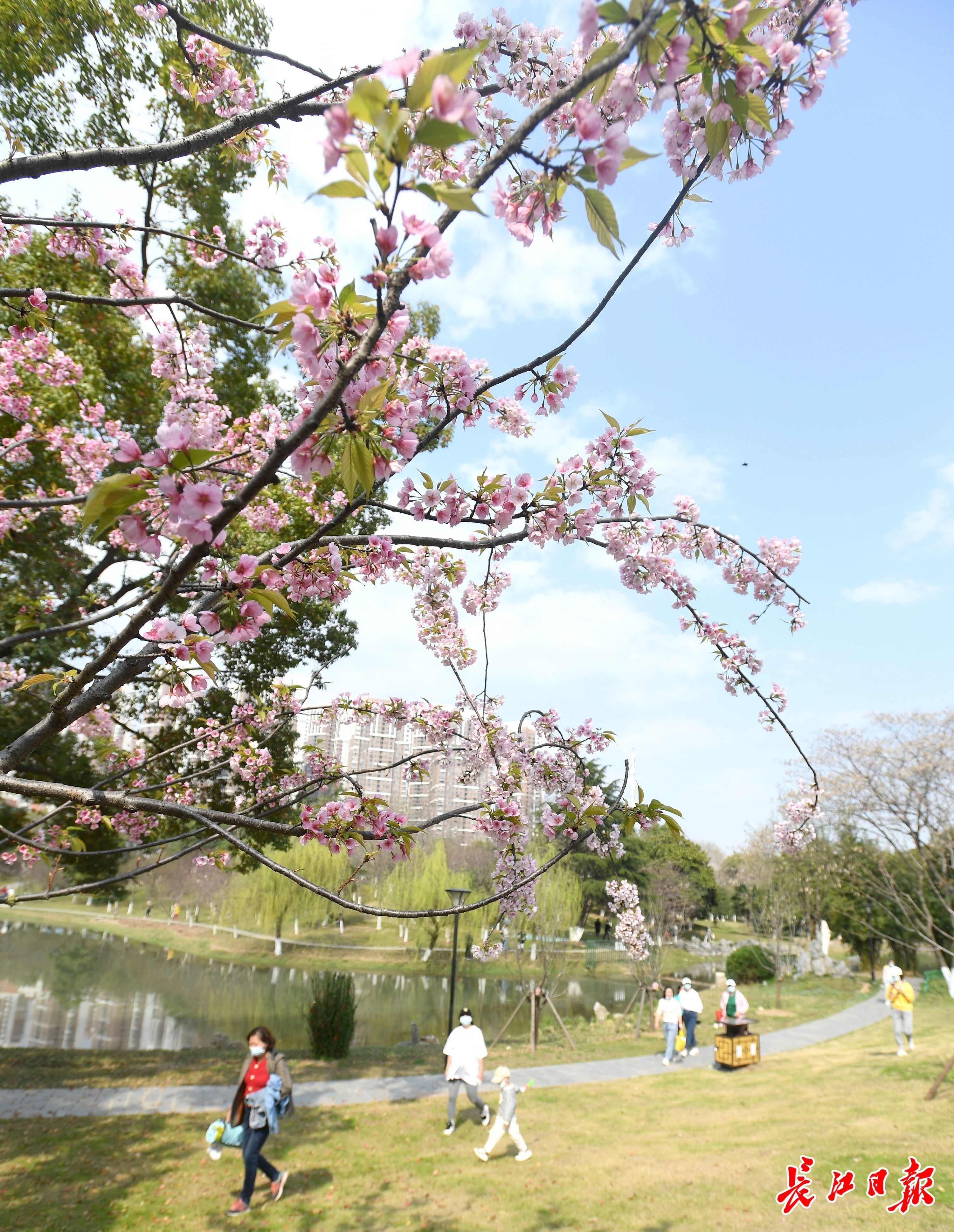 堤角公园南大门旁,大片染井吉野樱夹道相迎,初现花海模样。