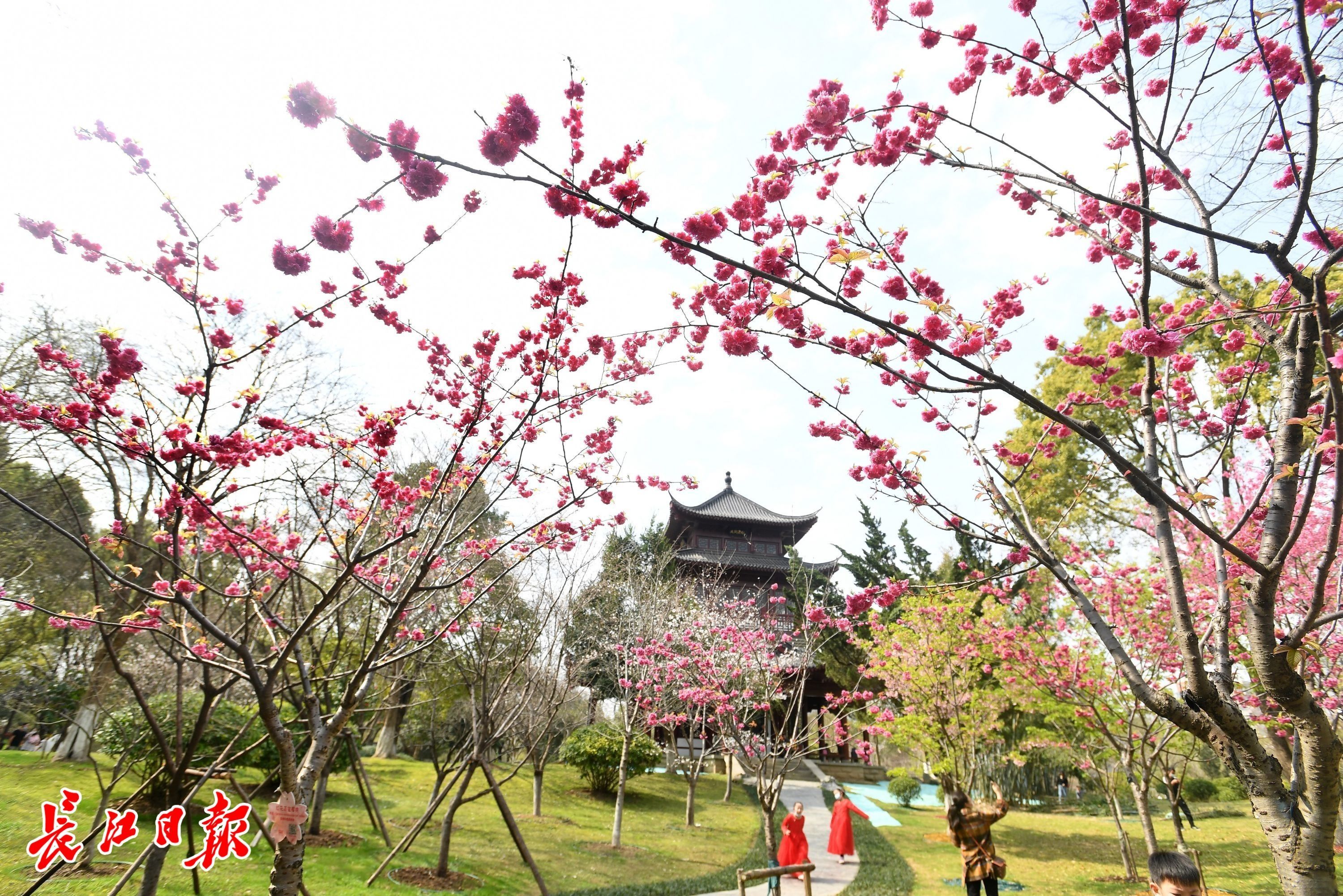 堤角公园是武汉公园中樱花品种最多之处,园花为樱花,品种达20余种,共1300余株,堪称江北赏樱胜处。2022年3月12日,长江日报记者一进公园南大门,大片染井吉野樱夹道相迎,初现花海模样;走进公园深处,闻风阁左侧杏花正盛,右侧樱花林里,大寒樱、大渔樱、八重寒绯樱、阳明山樱、红花高盆樱桃等早樱,红粉白次第开放,加上公园里同期绽放的梅花、杏花、李花、玉兰、桃花、绣球花等,春意盛极,20多公顷的公园里,步步见樱,处处轻云。