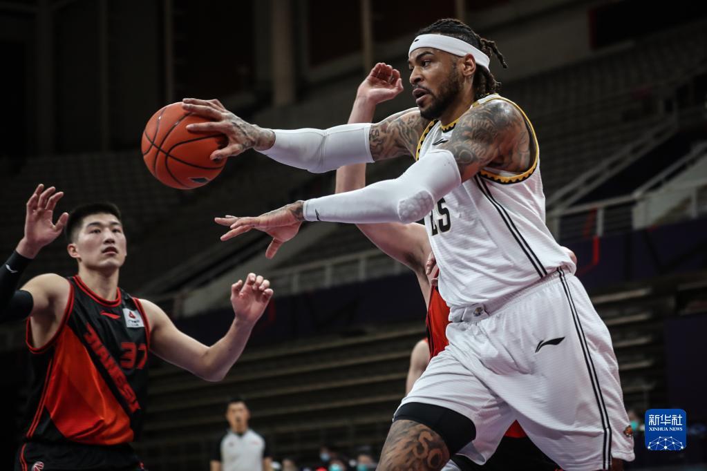 3月11日,辽宁本钢队球员莫兰德(右)在比赛中传球。新华社记者 潘昱龙 摄