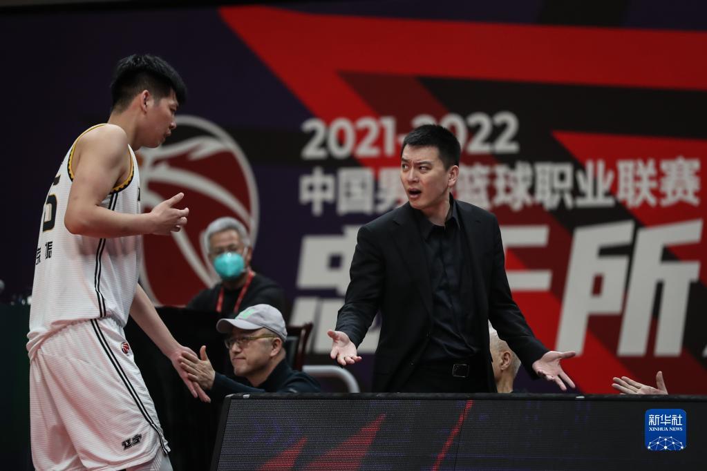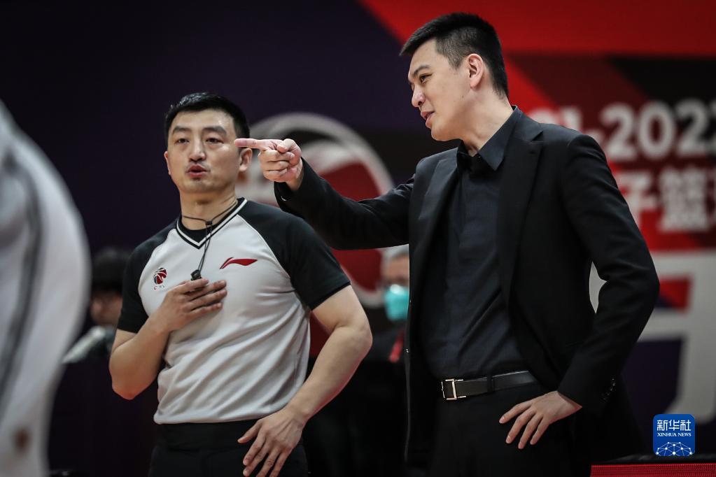 3月11日,辽宁本钢队主教练杨鸣(右)在比赛中与裁判交流。新华社记者 潘昱龙 摄