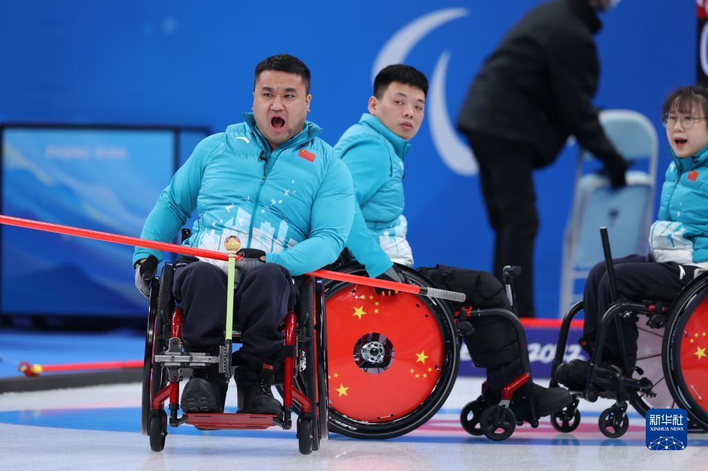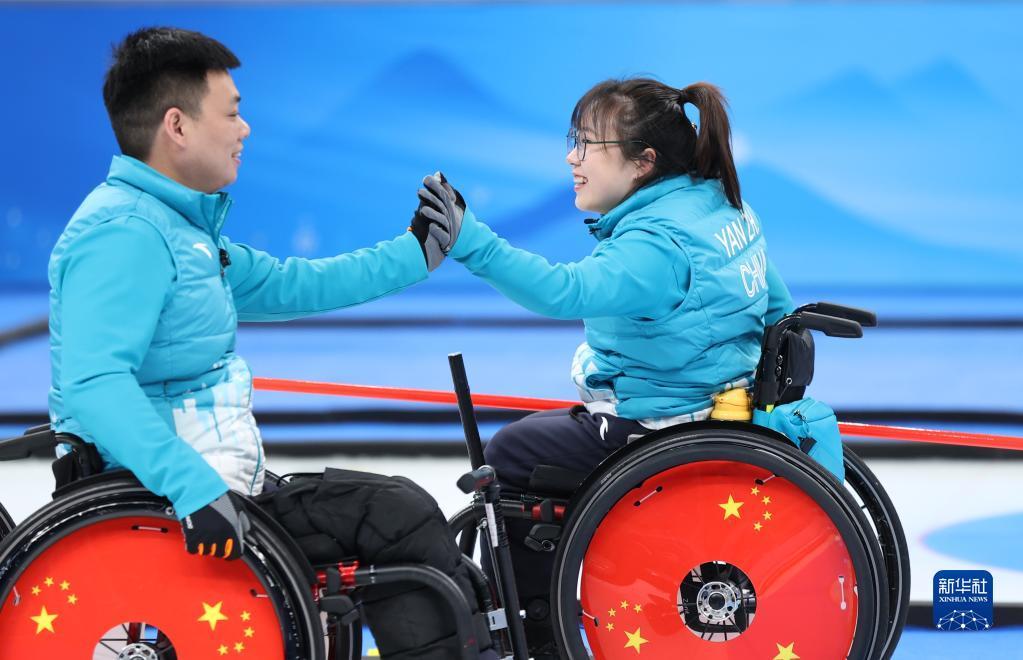3月12日,中国队选手闫卓(右)和张明亮在比赛中庆祝。当日,在北京国家游泳中心“冰立方”举行的北京2022年冬残奥会轮椅冰壶金牌赛中,中国队对阵瑞典队。新华社记者 杜潇逸 摄