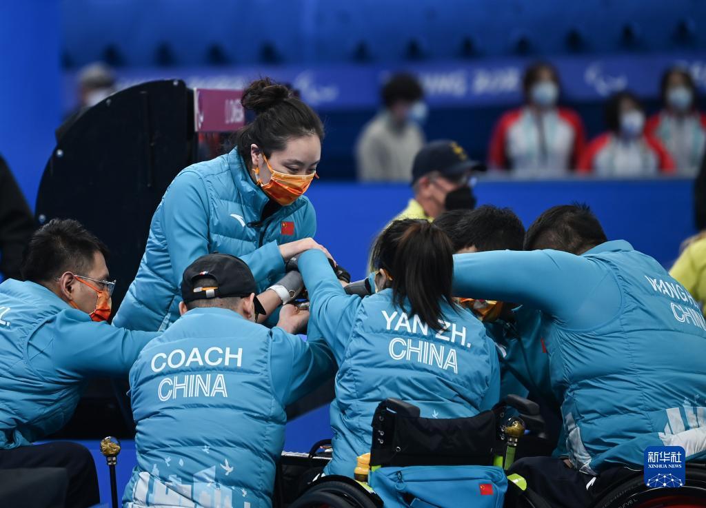 3月12日,中国轮椅冰壶队教练岳清爽(后)与队员在比赛前加油。新华社记者 张博文 摄
