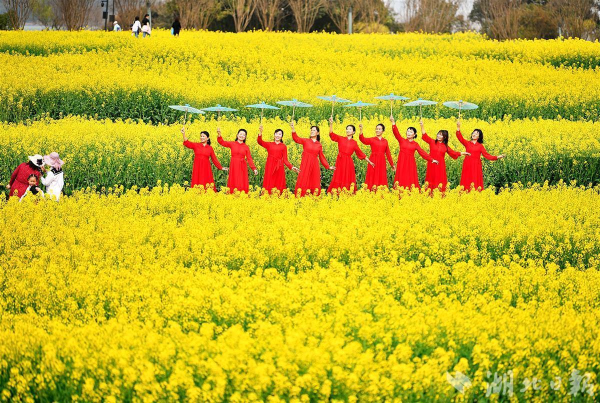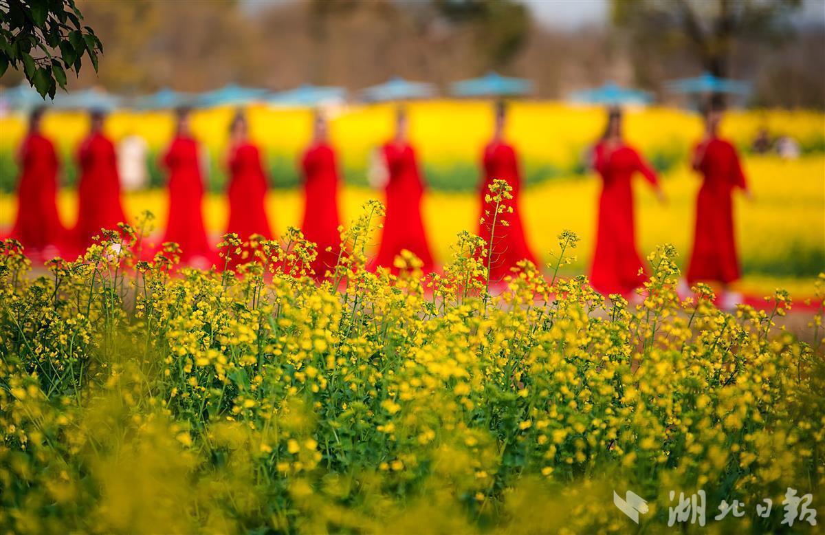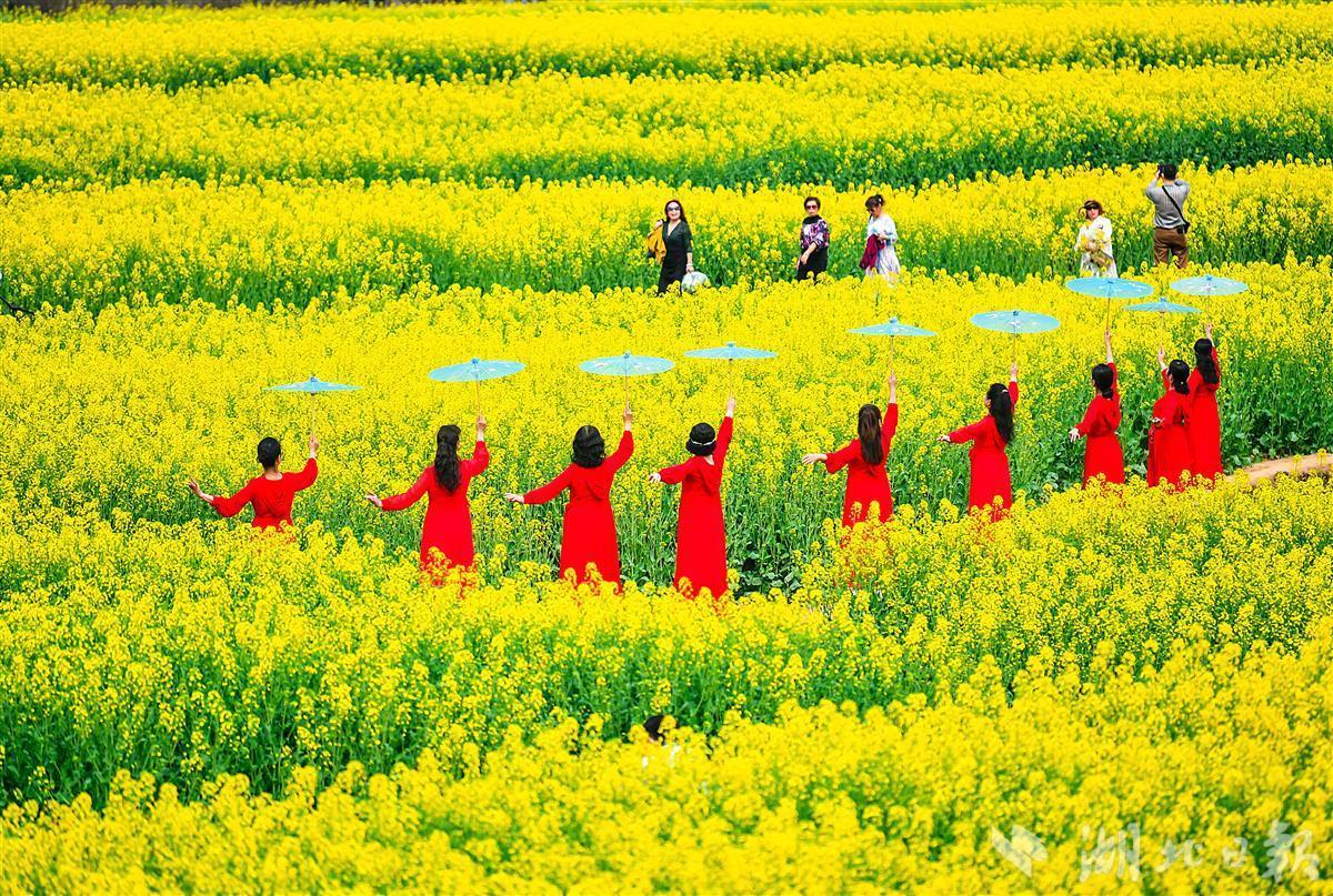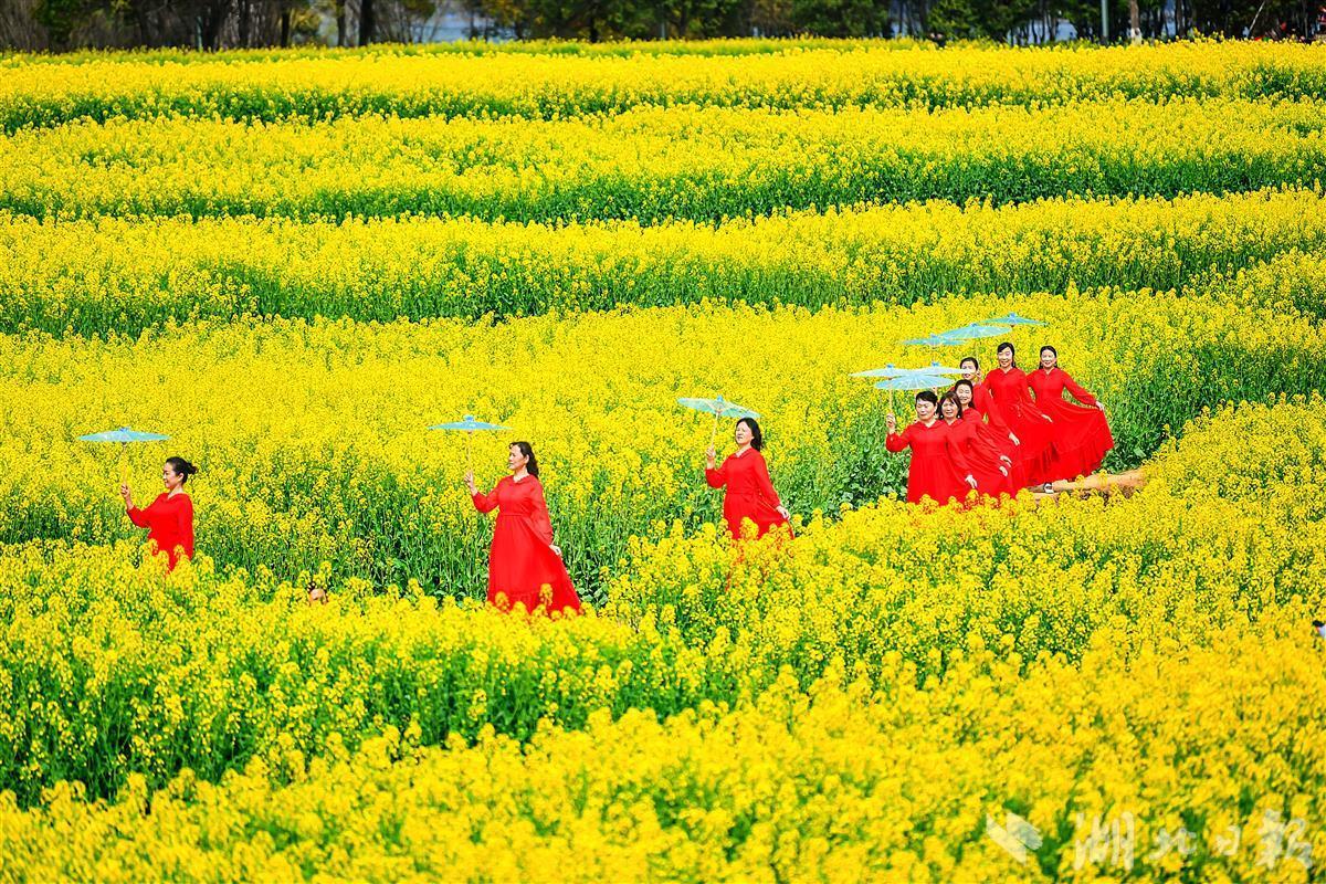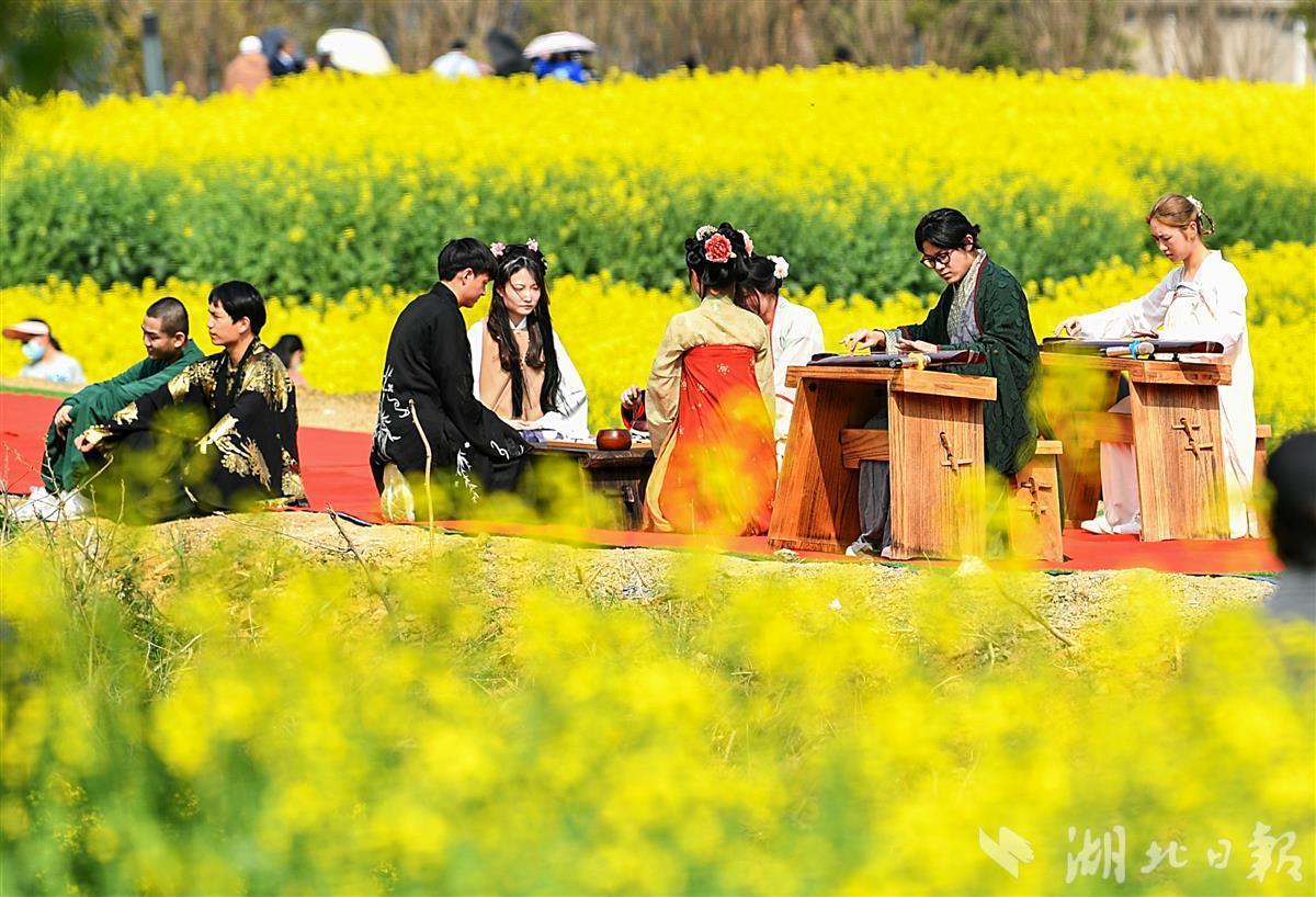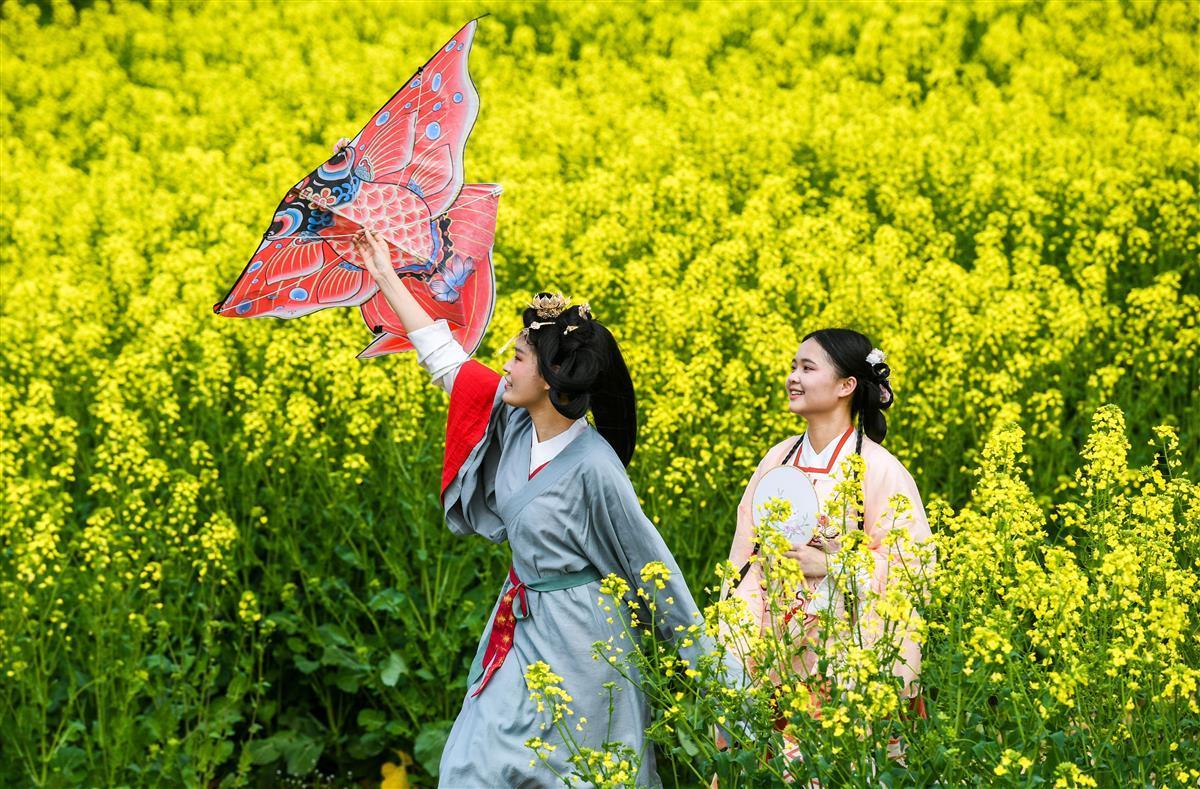 在花田的田埂上,一群身着汉服的少男少女们踏春赏花,嬉笑声飞扬花间。