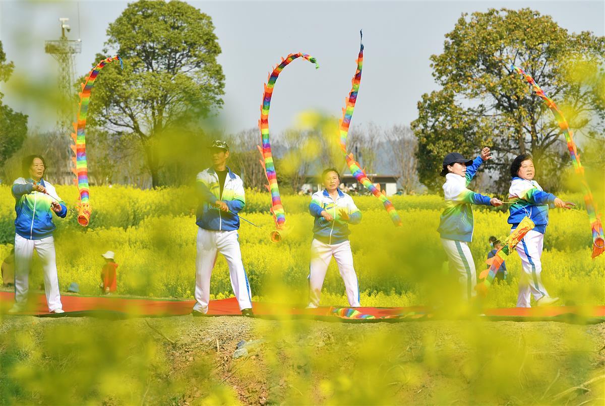 一队身着红色时装撑着花伞的女士游弋田间,像红色云彩飘逸。还有舞龙彩带上下翻滚飞腾。