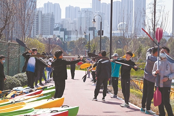 3月10日,华中科技大学校园内,有身着救生服的大学生们上水上运动课——在校园内的湖溪河上款款泛舟。碧波粼粼,白桥绿树间,学子们划着五颜六色的皮划艇,徜徉在湖溪河,船桨在水面激起阵阵浪花。