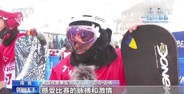 美国残奥单板滑雪运动员 迈克·迈纳 :非常有趣,跟其他运动员一起感受比赛的脉搏和激情,这里有超多的正能量。这是我第一次来中国,我有很多朋友在这,所以希望今后有机会我能再到中国来,中国人真的太友好了。