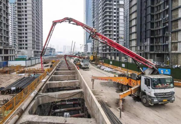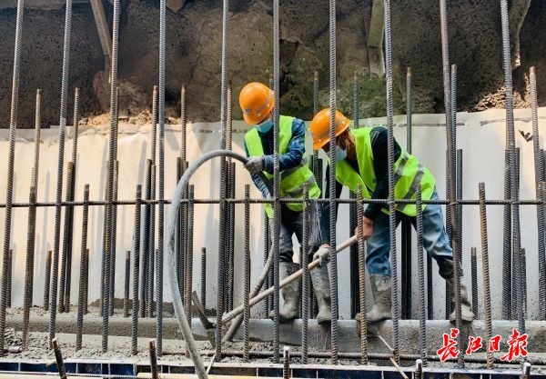 13时许,长江日报记者顺着工程笼梯而下,进入地下13米深的主线段基坑底部,只见一根混凝土输送管从空中垂下,伸入基坑,施工人员正在浇筑最后一车混凝土。