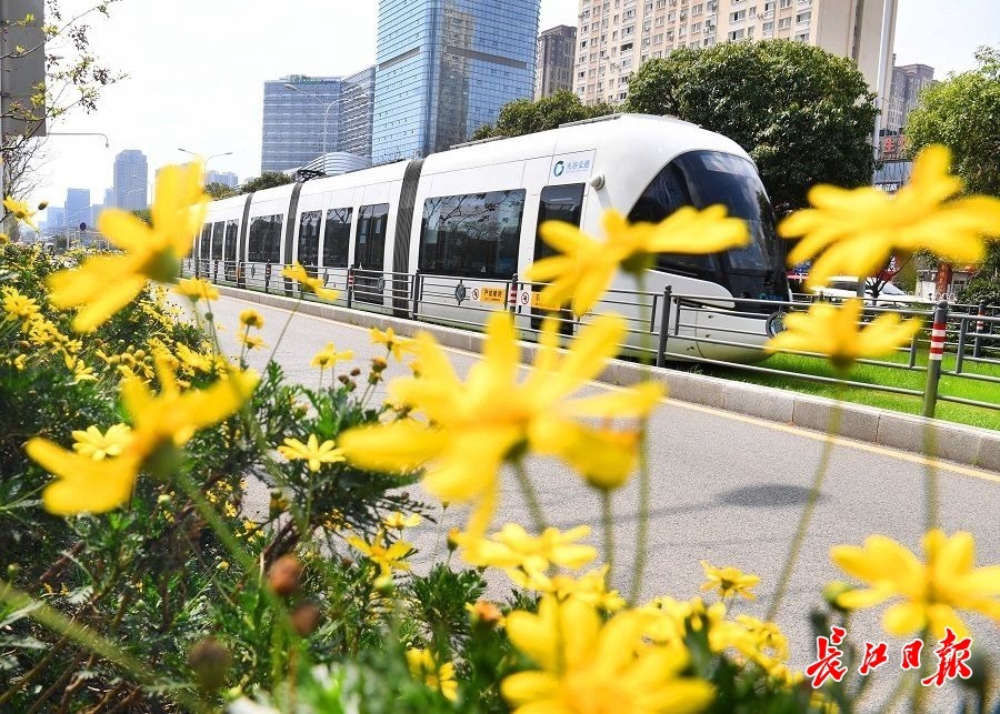 高楼林立的关山大道上,一列“光谷量子号”有轨电车从盛开的黄金菊前驶过。记者高勇 摄