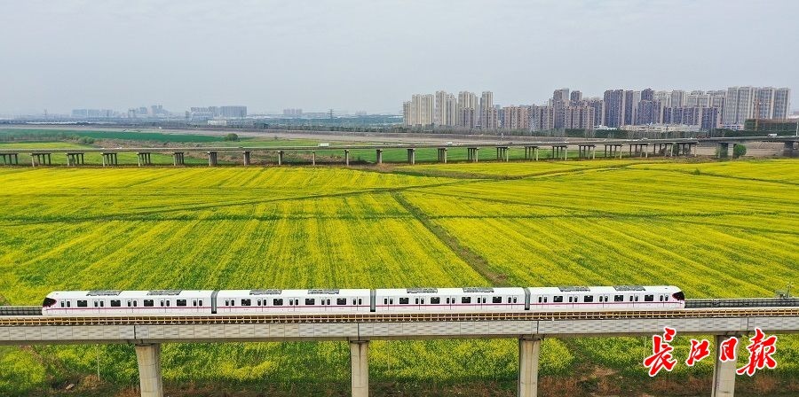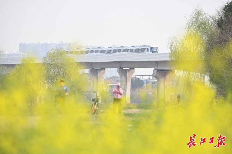 沌口江滩油菜花盛开,武汉地铁16号线驶过。记者史伟 摄