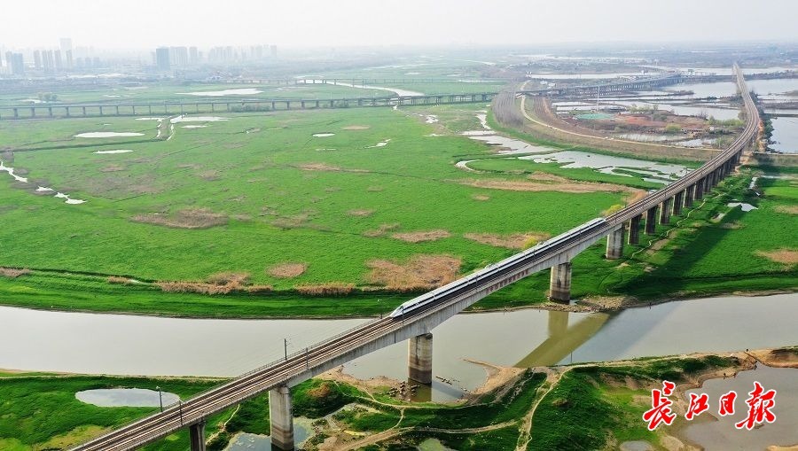 汉孝城际铁路,一列复兴号从府河穿过。记者金振强 摄
