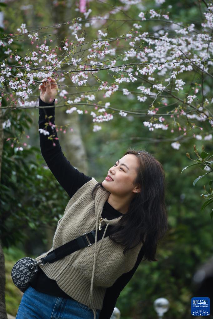 3月15日,游客在建德市三都镇前源村八亩丘山岭上观赏野樱花。