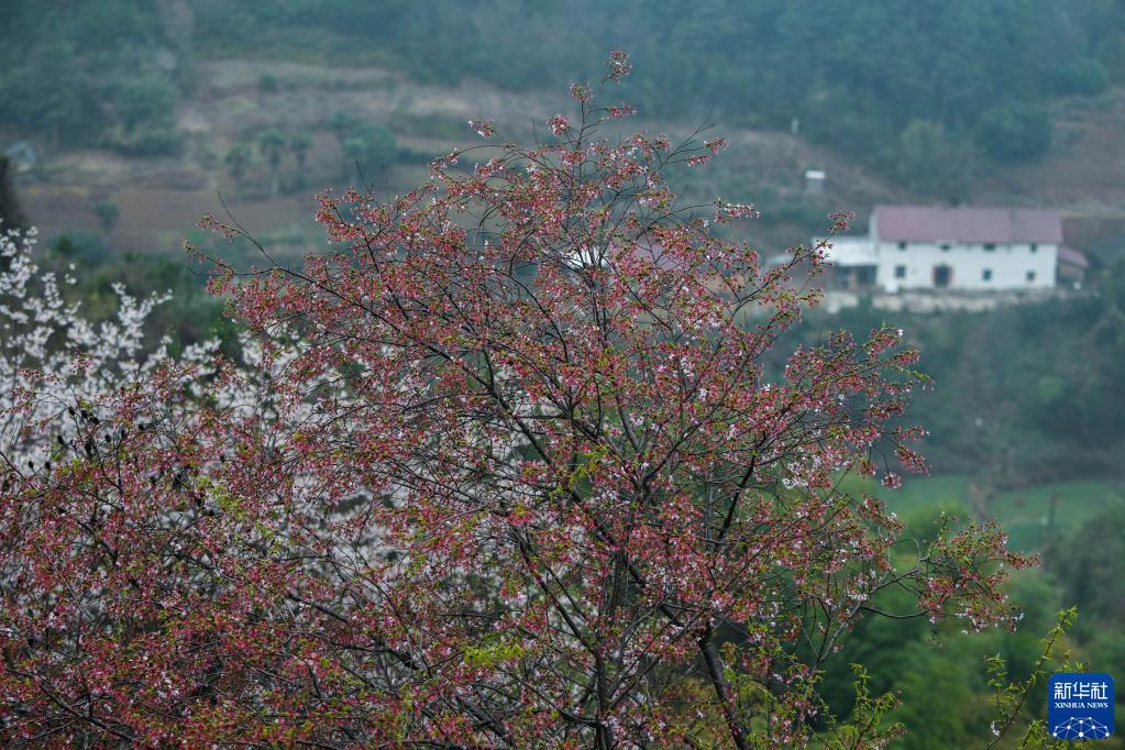 3月15日,建德市三都镇前源村八亩丘山岭上一家民宿前野樱花盛开。