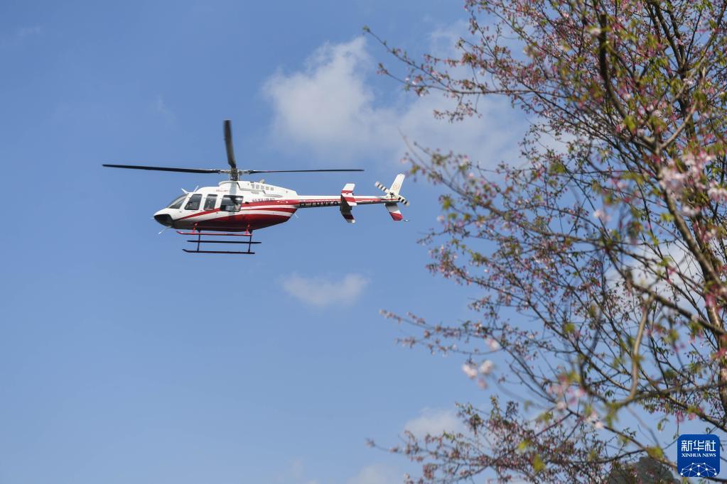 3月15日,游客搭乘直升机“空中赏樱”。