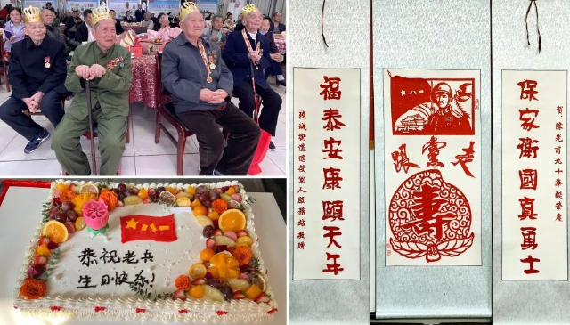 为表达对老兵们的尊崇之情,近日,宜都市陆城街道退役军人服务站筹办了一场“集体生日会”,老兵家属、退役军人代表50余人欢聚一堂,共同为100周岁、90周岁生日的8名抗战老兵和抗美援朝老兵庆祝生辰。