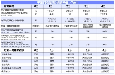 当然,觉得眼睛干不一定就是干眼。平时如果觉得眼睛有干涩、不适的感觉,可以先通过以下干眼问卷量表来初步判断自己的干眼情况。如果比较严重则需要去医院通过泪河宽度、泪膜破裂时间以及泪液分泌实验Ⅰ等检查来进一步明确自己的泪液情况。
