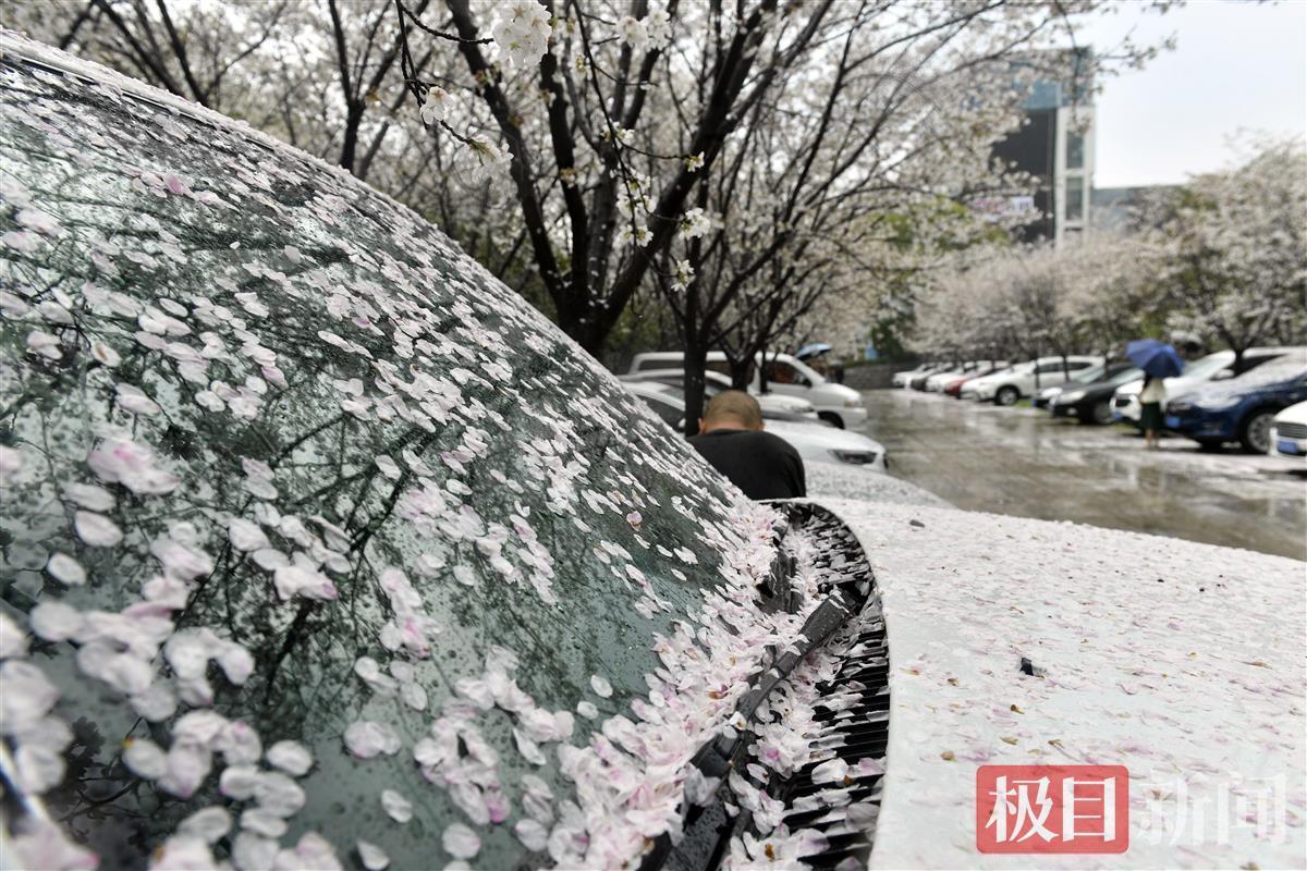在武昌东湖路樱花停车场,洒落了一地的樱花瓣,让人感觉美不胜收。