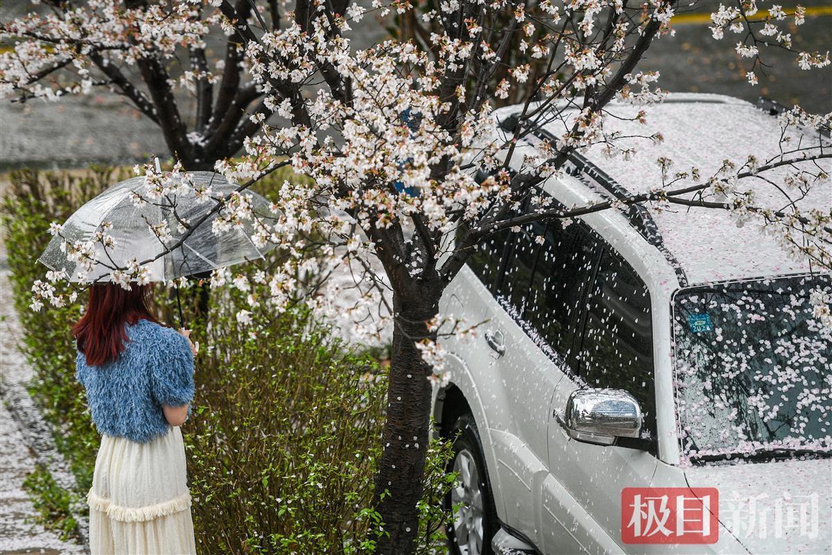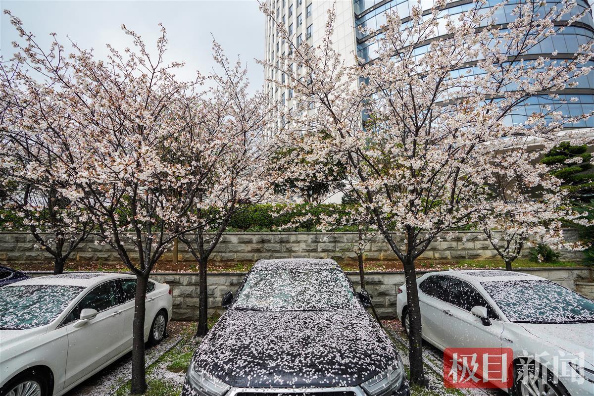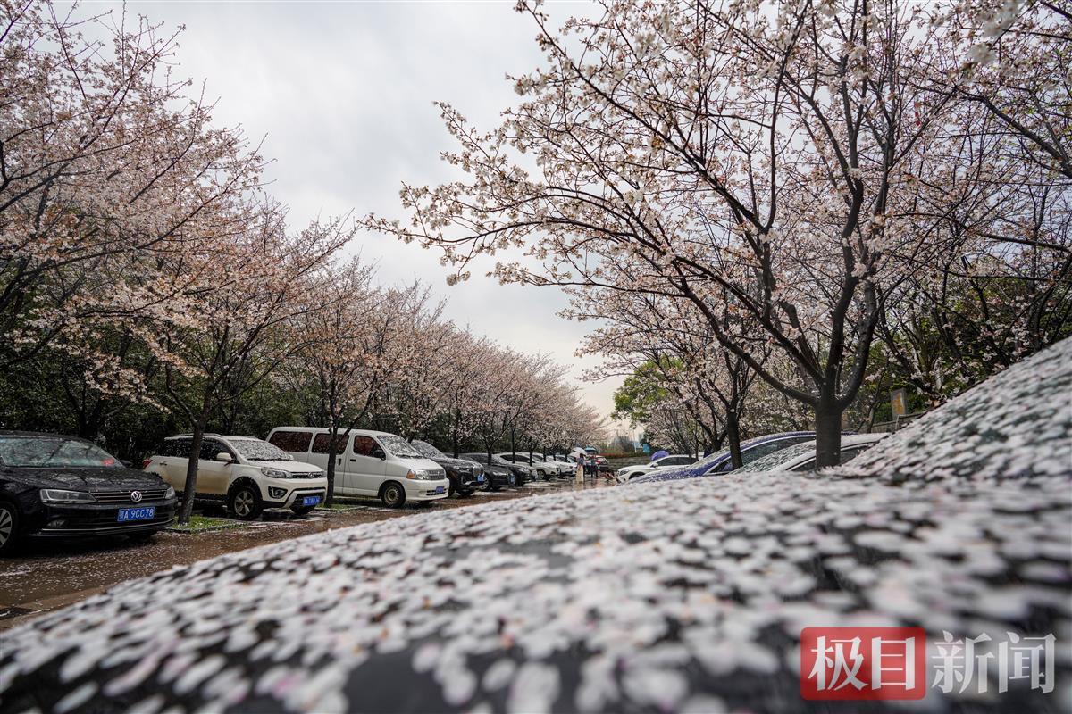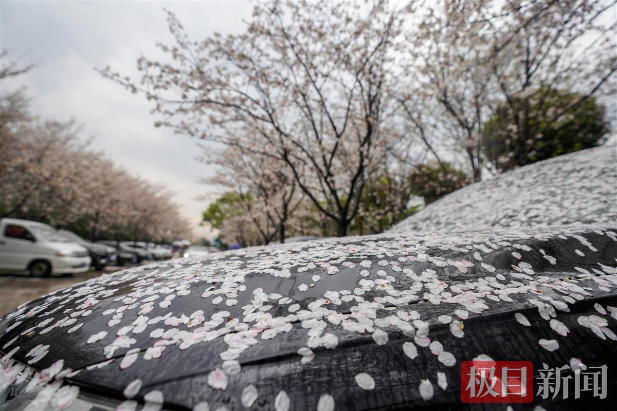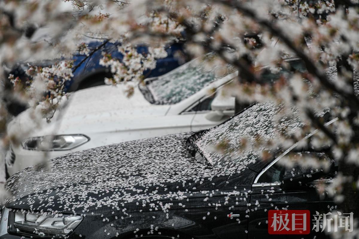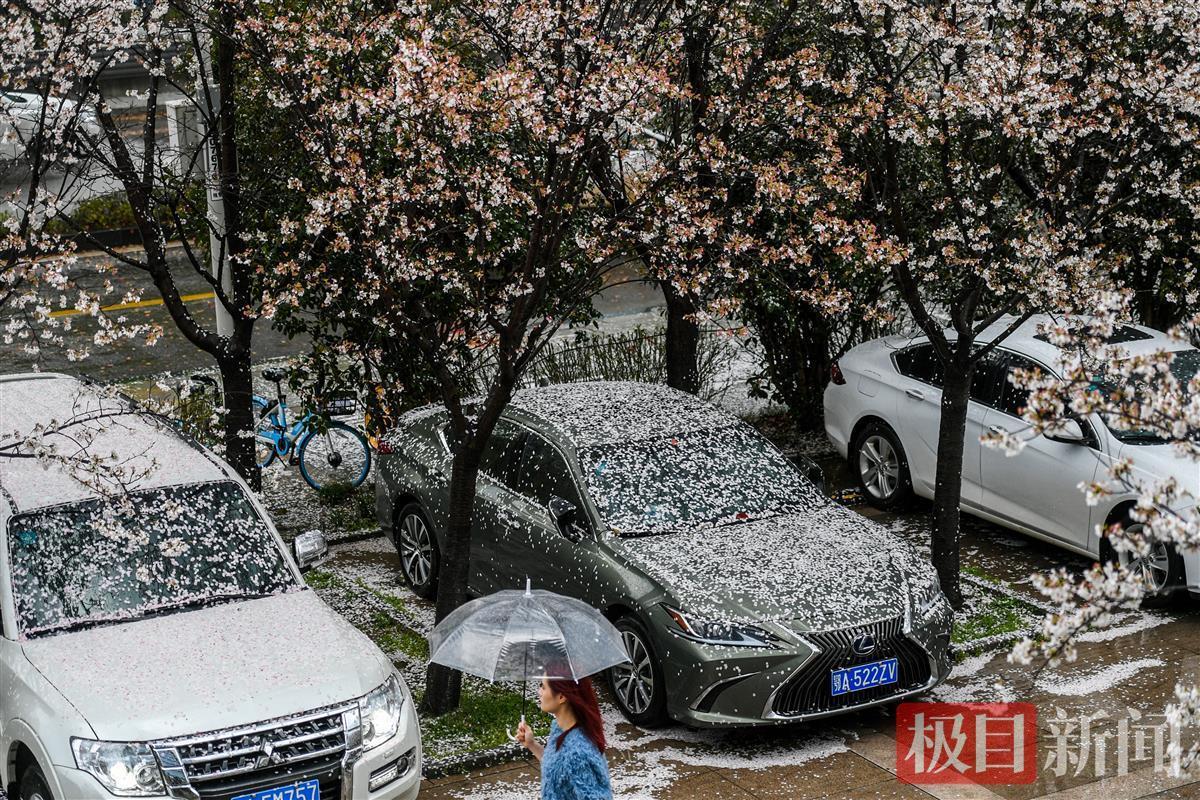 3月16日下午,一场暴雨来袭,武汉市武昌东湖路上一片樱花林,狂风暴雨中花瓣如雨般纷纷飘落,地面水面上落樱无数。雨后飘落的樱花铺满地面,一片粉色。花开花落,皆是风景。落樱满地别有情趣。