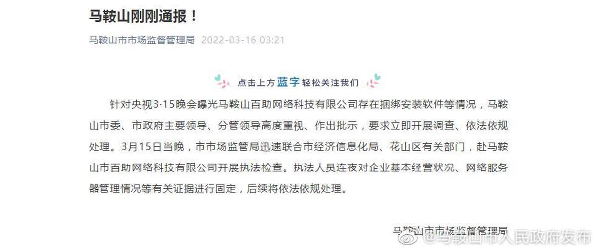 3月16日,安徽省马鞍山市市场监督管理局发布通告称,针对央视3·15晚会曝光马鞍山百助网络科技有限公司存在捆绑安装软件等情况,3月15日当晚,马鞍山市市场监管局迅速联合市经济信息化局、花山区有关部门,赴马鞍山市百助网络科技有限公司开展执法检查。执法人员连夜对企业基本经营状况、网络服务器管理情况等有关证据进行固定,后续将依法依规处理。