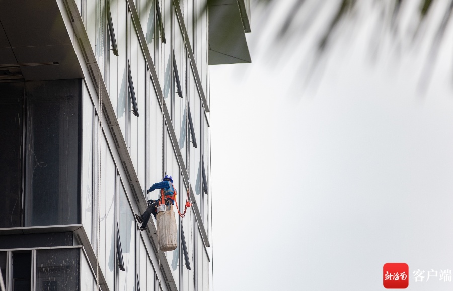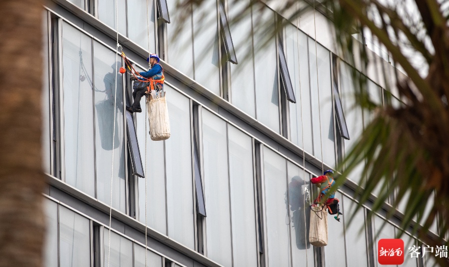 3月16日,在海口市江东新区起步区的江东·国际能源中心项目,工人在组装外幕墙。记者 李昊 实习生 朱勃羽 摄