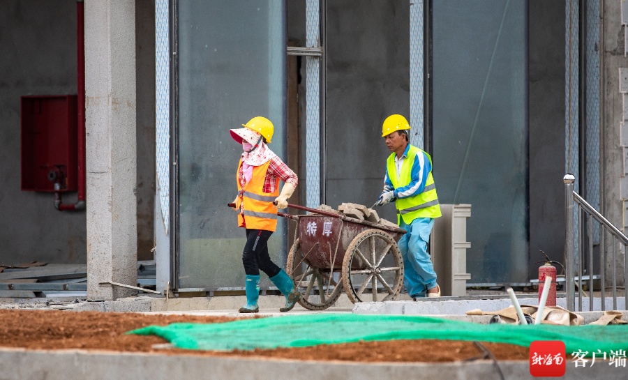 3月16日,在海口市江东新区起步区的江东·国际能源中心项目,工人正在作业。记者 李昊 实习生 朱勃羽 摄