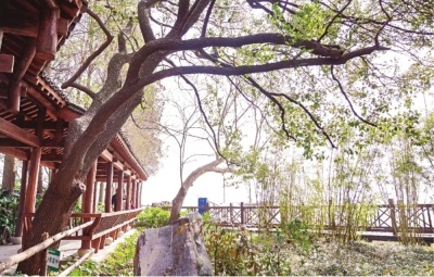 湖光阁里的园路为樟树让路。