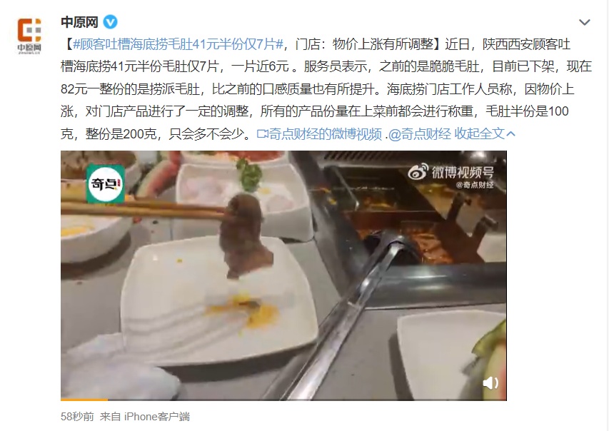 【顾客吐槽海底捞毛肚41元半份仅7片,门店:物价上涨有所调整】近日,陕西西安顾客吐槽海底捞41元半份毛肚仅7片,一片近6元 。服务员表示,之前的是脆脆毛肚,目前已下架,现在82元一整份的是捞派毛肚,比之前的口感质量也有所提升。海底捞门店工作人员称,因物价上涨,对门店产品进行了一定的调整,所有的产品份量在上菜前都会进行称重,毛肚半份是100克,整份是200克,只会多不会少。