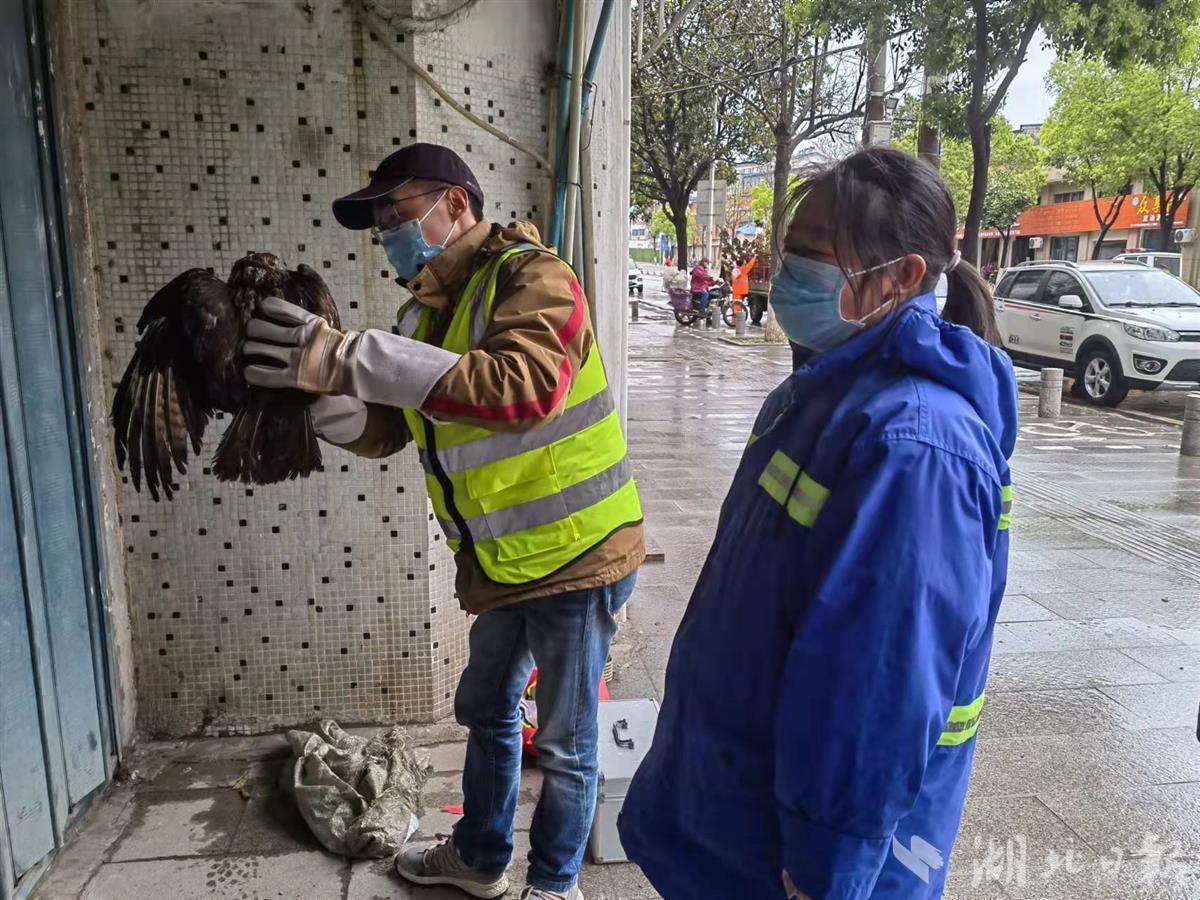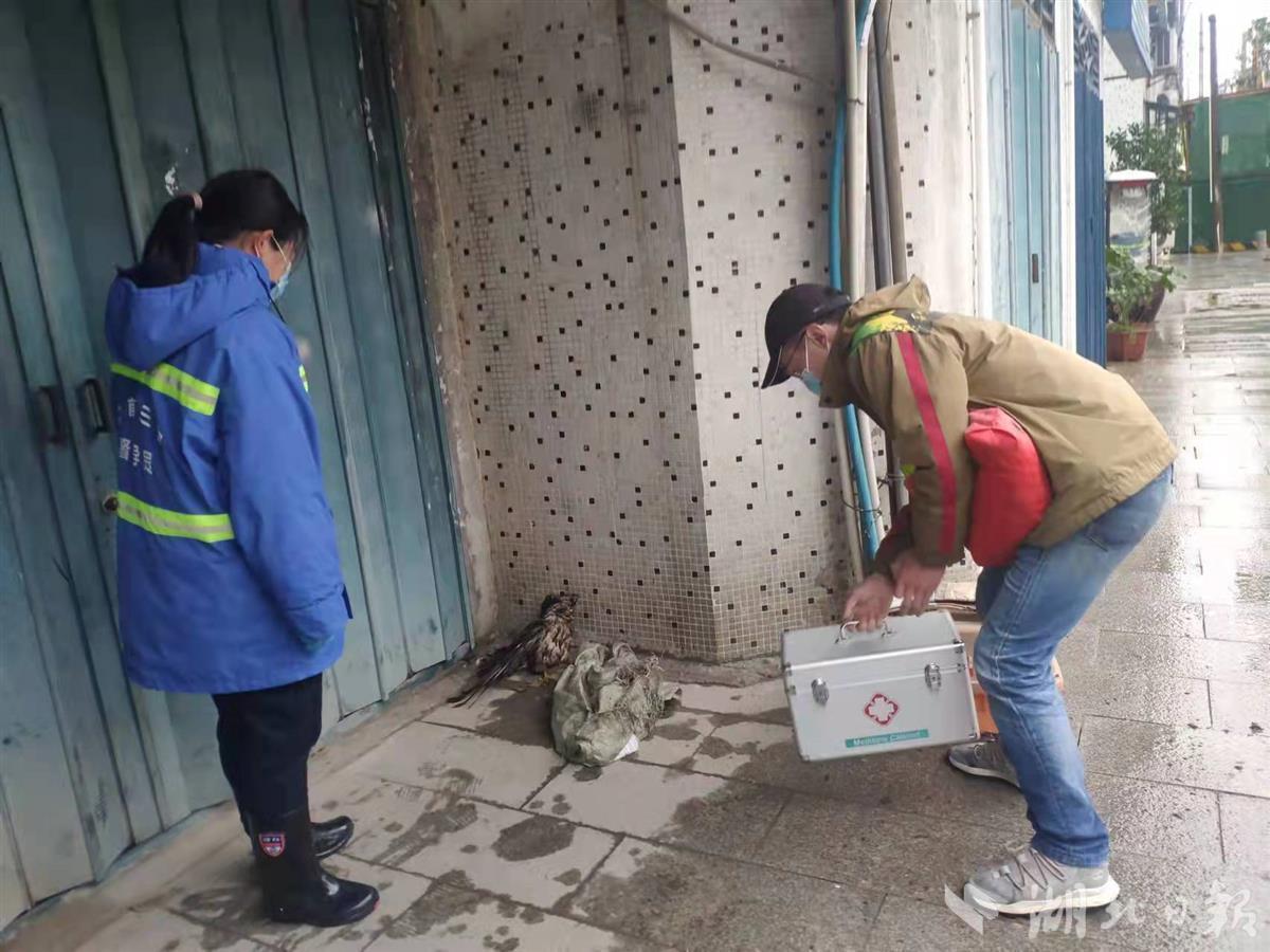 湖北日报讯(通讯员严娟娟、徐雅洁、徐飒)3月16日晚至17日凌晨,武汉发生强对流暴雨天气,一只成年棕尾鵟(音为kuáng)鹰折翅,在武汉市蔡甸城区街头屋角瑟瑟发抖。17日早上,蔡甸区门前三包督导员肖敏霞巡查时发现了这只国家二级保护动物,及时通知专家赶来救治。