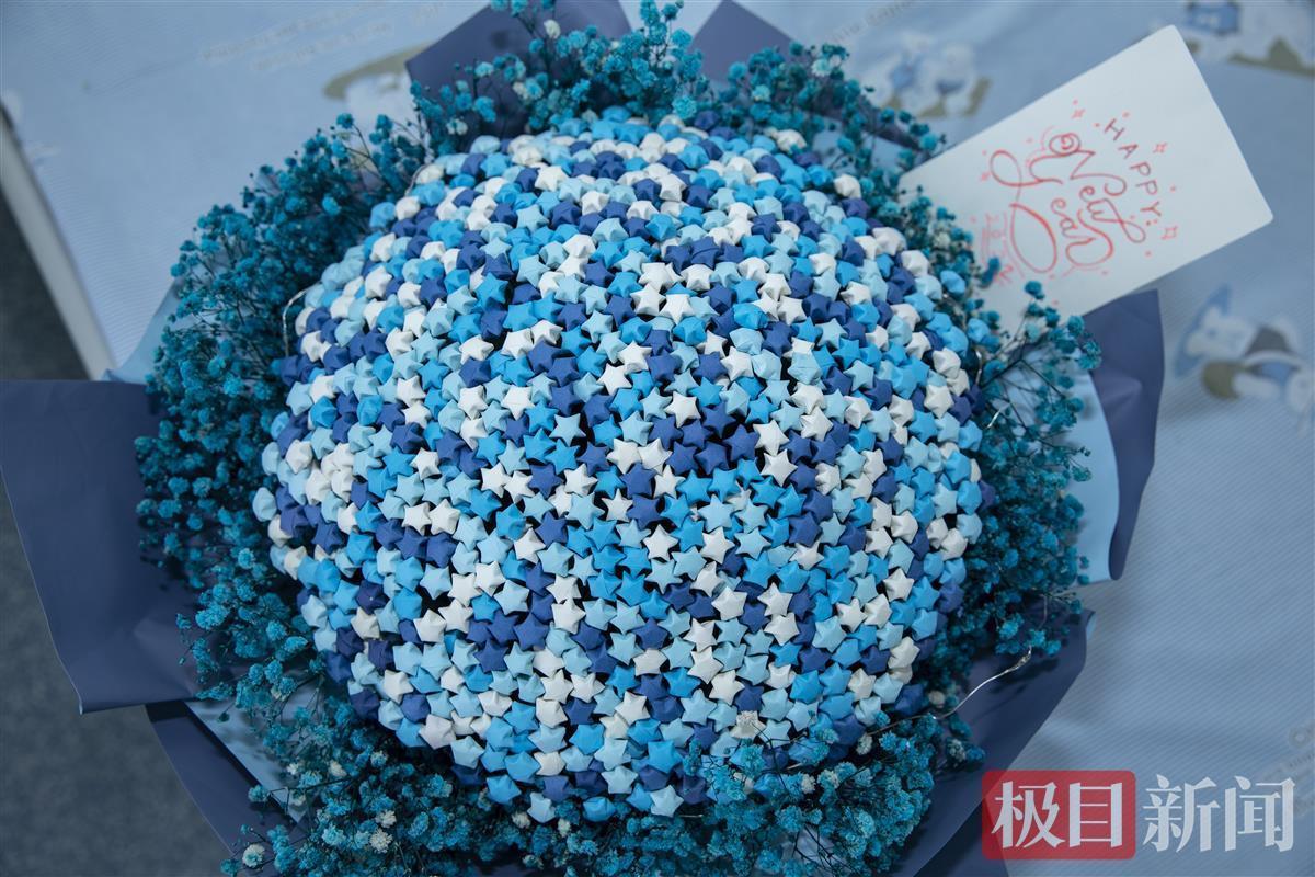 这个心灵手巧的小姑娘先在视频网站上“练手”,把星星折得像模像样后,她买来蓝色系材料、花泥等工具。闲暇时,彤彤和妈妈一起合作,折了666颗幸运星,并精心制作,将满天星做成了一大束蓝色色调的花。