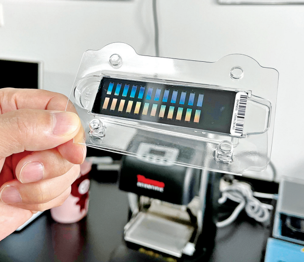 在育种实验室,周发松现场拿起一块不足半个手掌大的超薄黑色玻璃芯片向记者展示。这块芯片上的24个“灰色方块”中承载着4万个DNA探针,研究人员将待检测品种的DNA提取出来后与芯片上的探针进行杂交配对,根据配对后发出的光信号值即可分辨基因的功能。