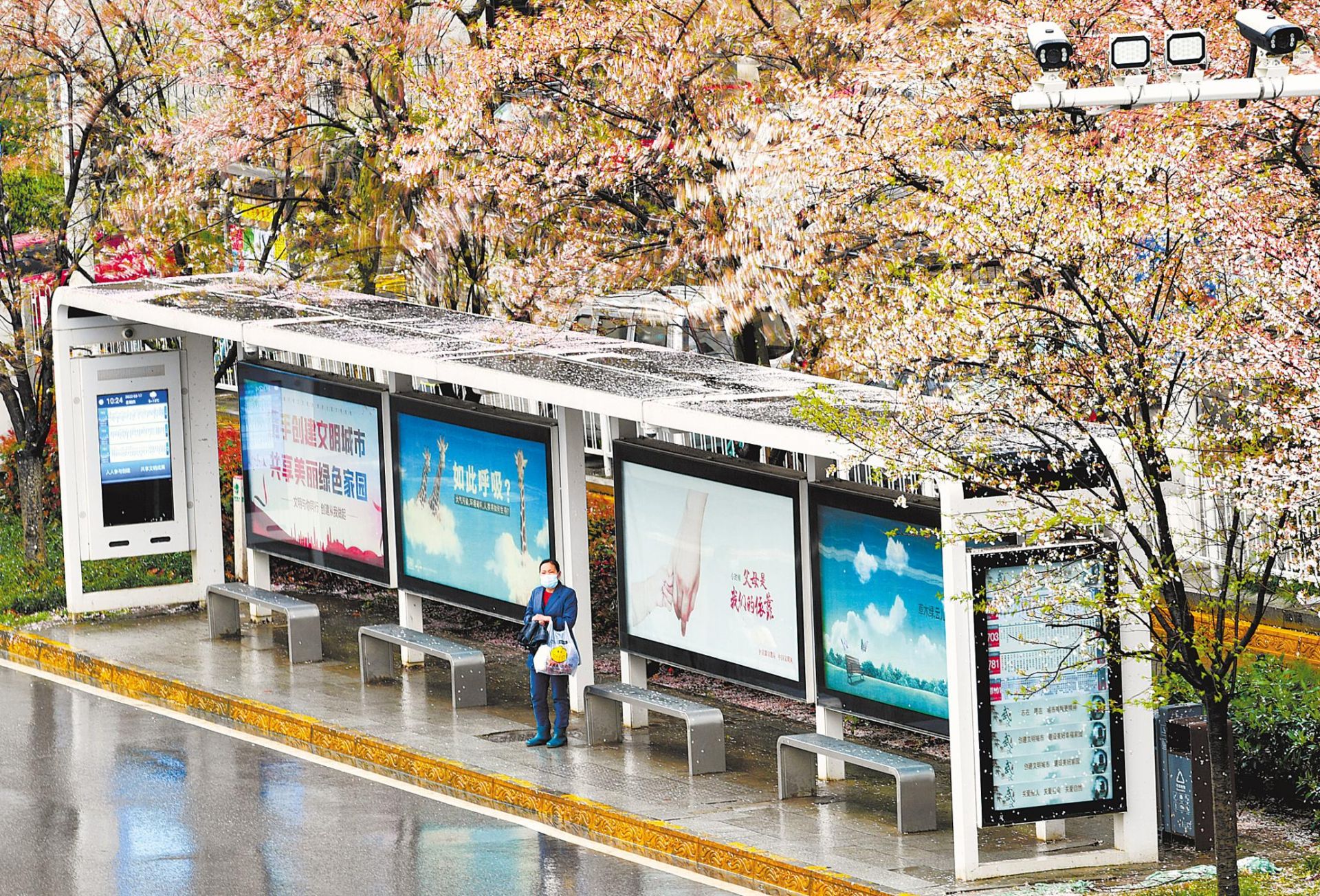 3月17日上午,武汉珞喻东路大黄村公交车站,整个车站被盛开的樱花树覆盖。雨后的樱花随风飞舞,不少花瓣飘落在站台边上,在车站两旁形成了近60米的樱花带,宛如一座独特的樱花公交车站。