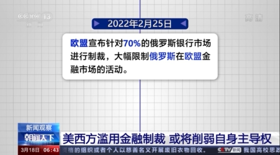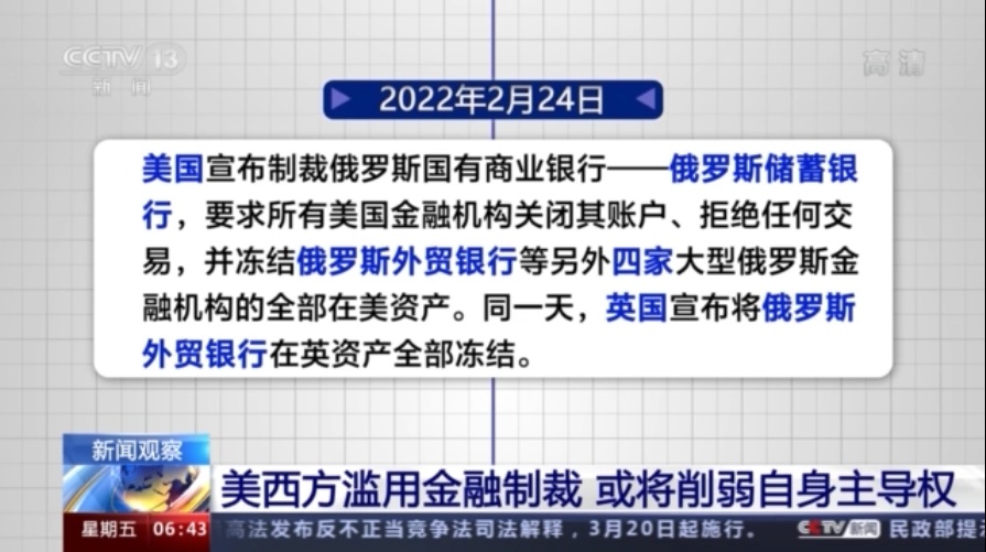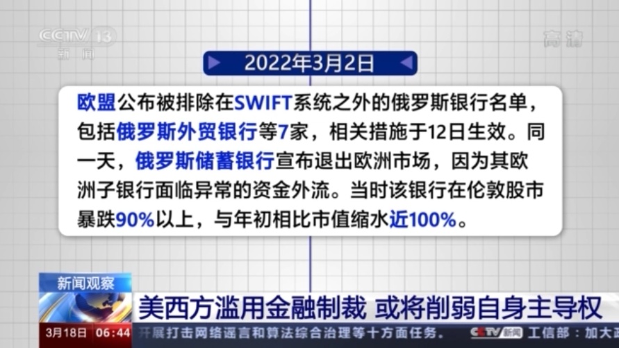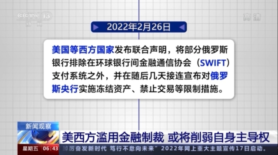 2月26日,美国等西方国家发布联合声明,将部分俄罗斯银行排除在环球银行间金融通信协会(SWIFT)支付系统之外,并在随后几天接连宣布对俄罗斯央行实施冻结资产、禁止交易等限制措施。