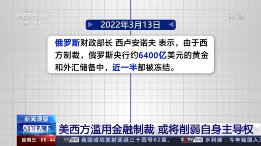 3月13日,俄罗斯财政部长西卢安诺夫表示,由于西方制裁,俄罗斯央行约6400亿美元的黄金和外汇储备中,近一半都被冻结。