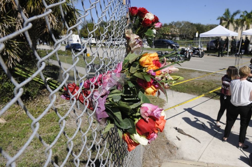 2018年2月15日,人们在美国佛罗里达州帕克兰市道格拉斯中学外放置鲜花悼念遇难者。新华社记者刘阳摄