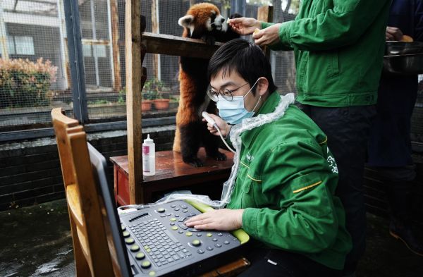 “10岁左右的美美,在小熊猫中年纪较大,现在不如年轻的小熊猫力气大。”在做B超的过程中,美美支撑支架的手臂数次垂下来。“加油美美,休息一会儿再站起来。”在苹果的奖励和饲养员的鼓舞下,美美终于完成了B超检测。“苹果分量消耗特别大,美美这次吃爽了,其他小熊猫该羡慕美美了。”