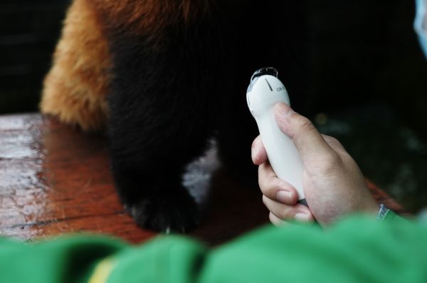 为了让糊米酒保持站立姿势,任妙璇还用手抚摸它的背部,似乎是享受人类对它的摩挲,糊米酒整整站了5分钟,体力优秀,B超检测得以顺利完成。“得益于前期的脱敏训练,主要是让小熊猫熟悉剃毛刀的震动感和探头的滑动感。我们给它一个持续的刺激,比如:在它享受美食的时候把电动剃毛刀放在它耳朵边,让它熟悉震动的声音。”任妙璇说,在一群小熊猫中,糊米酒的学习能力很快,不仅迅速适应了剃毛刀和探头,在苹果的引诱下,还快速学会了定点站立,且表现得耐性很强。“酒酒是所有1岁多的小熊猫群体中的模范生,对脱敏训练有很强的正向反应。”