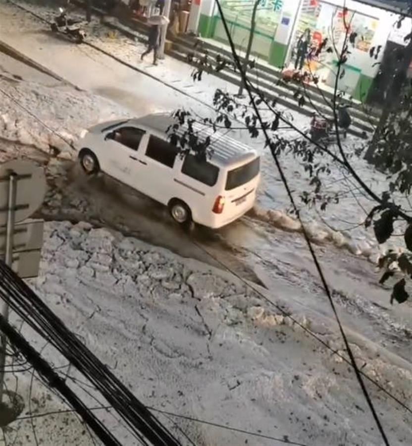 当地市民拍摄的现场视频显示,宣威倘塘镇街头,道路上堆积了一层厚厚的冰雹,大量树叶被冰雹打落。从市民拍摄的视频中可以看到,有的冰雹个头大如鸡蛋。