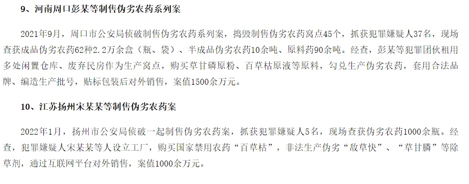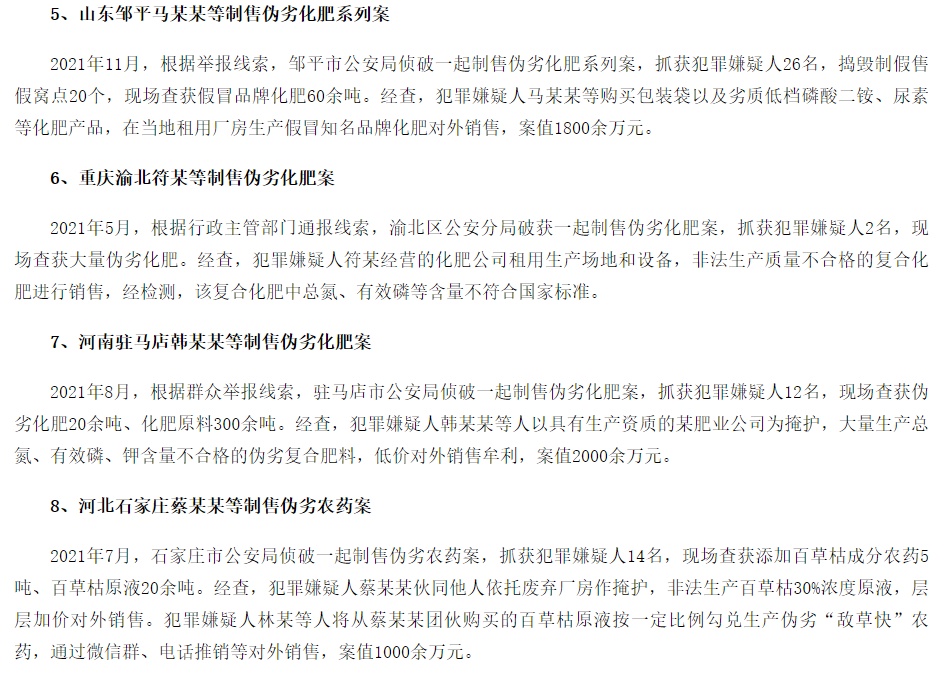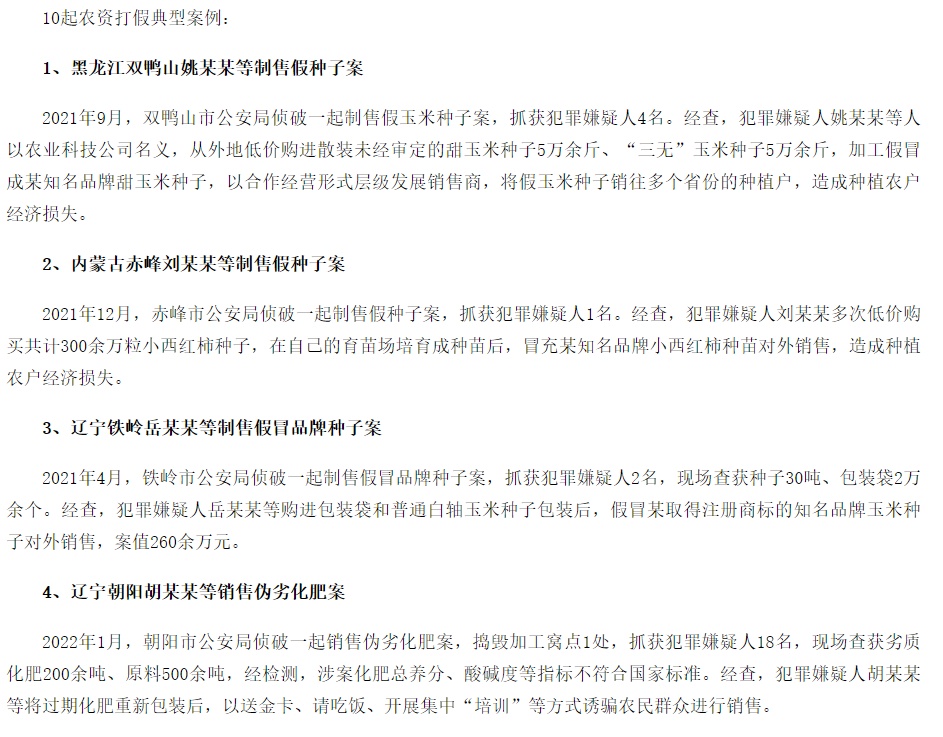 去年以来,全国公安机关认真贯彻落实党中央决策部署,按照公安部部署要求,在“昆仑2021”专项行动中聚焦种子、农药、化肥等春耕急需必备物资,会同有关部门深入开展农资打假专项治理,依法严厉打击制售假劣农资犯罪,取得重大战果。2021年公安机关共侦破农资犯罪案件600余起,抓获犯罪嫌疑人1100余名,公安部挂牌督办18起重大农资案件全部告破,有力打击震慑了此类违法犯罪,切实服务保障了国家粮食安全和民族种业振兴,维护了广大人民群众合法权益。公安部今日公布10起典型案例。