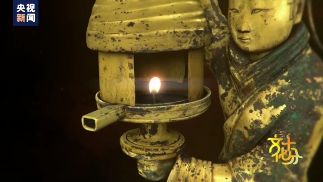 故宫博物院文物管理处 “何以中国”文物特展筹展组成员 赵曾健:长信宫灯宫女灯体的右袖和整个灯是相连的,我们都知道长信宫灯在烧完之后的废气,可以通过袖口进入到宫体的主体之中,方便清理,也暗合我们的环保理念。
