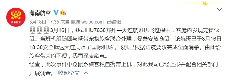海南航空表示,3月16日,我司HU7638郑州—大连航班执飞过程中,客舱内发现宠物仓鼠。当班机组随即与携带宠物旅客联合处理,妥善安放仓鼠。该航班已于3月16日18:38安全抵达大连周水子国际机场,飞机已根据防疫要求完成全面消杀。