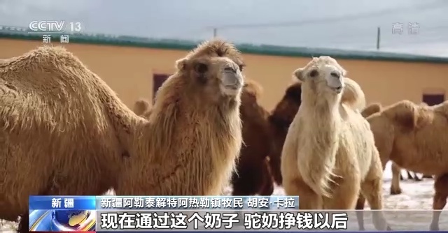 阿勒泰解特阿热勒镇牧民 胡安·卡拉:以前我们十几峰骆驼,专门转场用,就是搬家,现在通过这个奶子,驼奶挣钱以后,养的就越来越多,现在养了100多峰骆驼,我们都要培训怎么挤奶,怎么养骆驼?怎么用饲料那些。