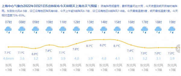 上海中心气象台2022年3月21日5点钟发布今天和明天上海市天气预报:阴有阵雨或雷雨,累积雨量可达大雨,今天夜里到明天阴有时有阵雨。东到东北风4-5级,沿江沿海地区阵风有6级,今天上午起5级阵风6-7级,沿江沿海地区6级阵风7-8级。今天最高温度9度,明天最低温度7度。