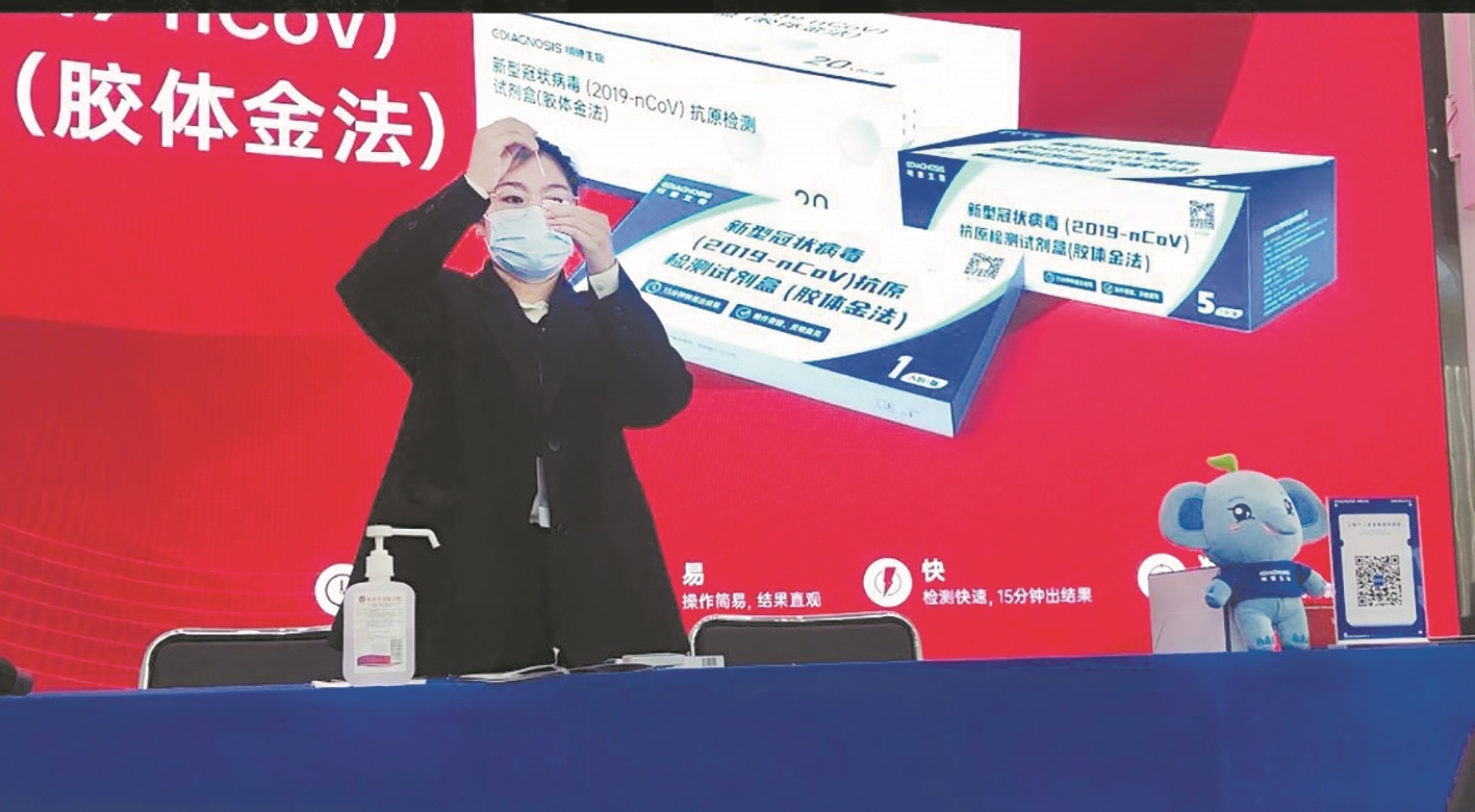 工作人员示范如何使用抗原检测试剂
