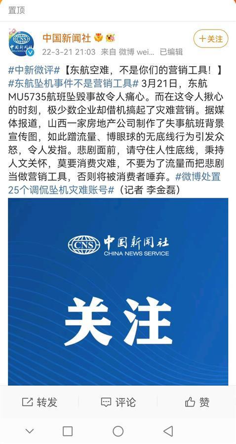 21日晚9时许,中国新闻社发文表示:“东航空难,不是你们的营销工具!东航航班坠毁事故令人痛心,而在这令人揪心的时刻,极少数企业却借机搞起了灾难营销。悲剧面前,请守住人性底线,秉持人文关怀,莫要消费灾难,不要为了流量而把悲剧当作营销工具,否则将被消费者唾弃。”