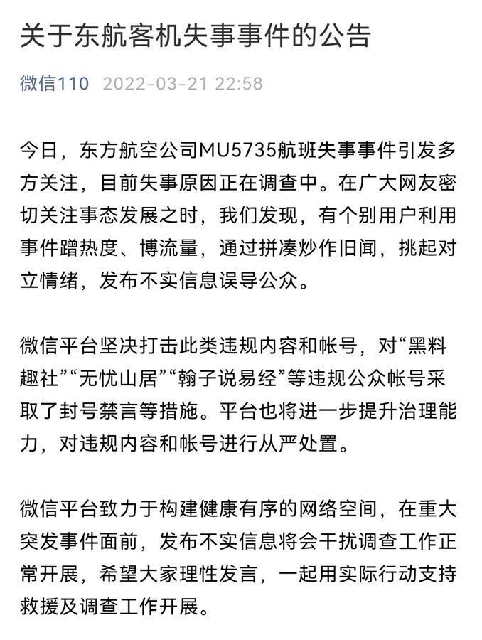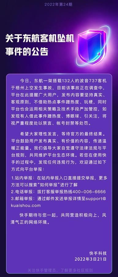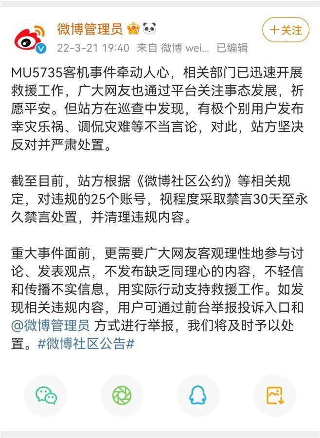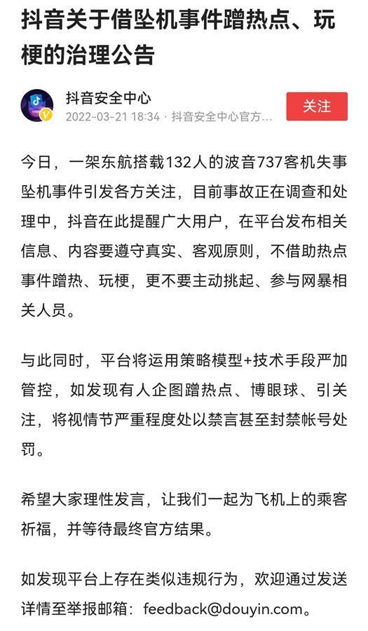 针对炒作失事客机蹭热度、发布不实信息、调侃坠机的言论,抖音、快手、微信110、微博等多平台紧急发布公告。多平台表示,将运用技术手段严加管控,坚决打击此类违规内容和账号,鼓励用户发现相关违规内容后进行举报投诉。平台已经处理了一部分违规账号,希望用户自觉遵守法律法规与平台规则,对此事理性发言,等待官方的最终结果。