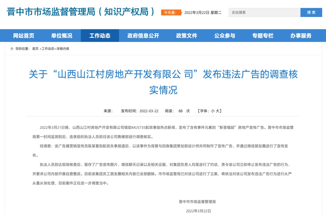 2022年3月21日晚,山西山江村房地产开发有限公司借助MU5735航班事故热点新闻,发布了含有事件元素的“新晋福邸”房地产宣传广告。晋中市市场监管局第一时间监测到后,连夜组织执法人员前往该公司售楼部进行调查核实。