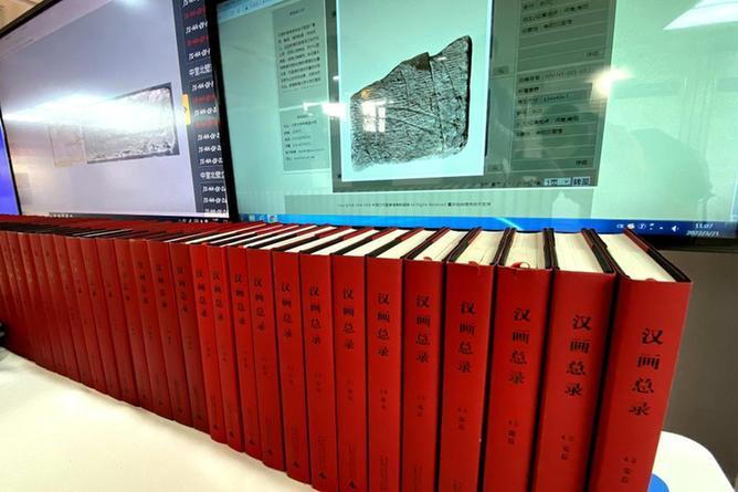 图为展览现场,屏幕展示的是汉代图像信息数据库中的汉代图像(新华社记者魏梦佳摄)