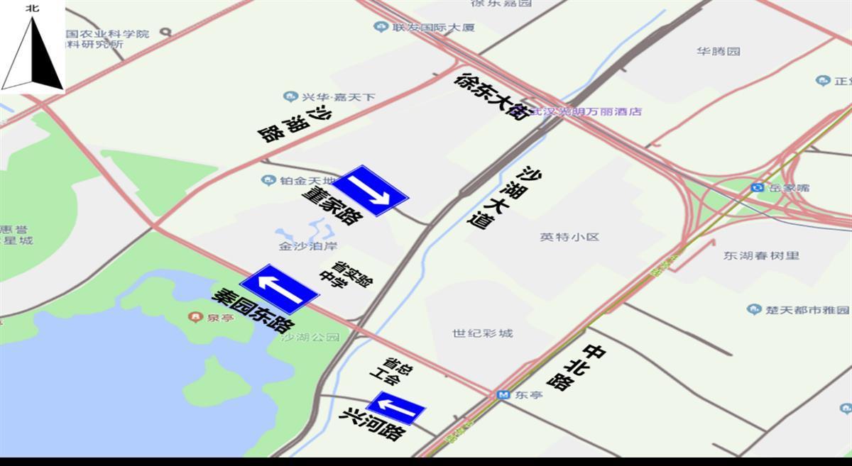 1、原由西向东经秦园东路去往沙湖大道方向的车辆可绕行沙湖路、董家路。